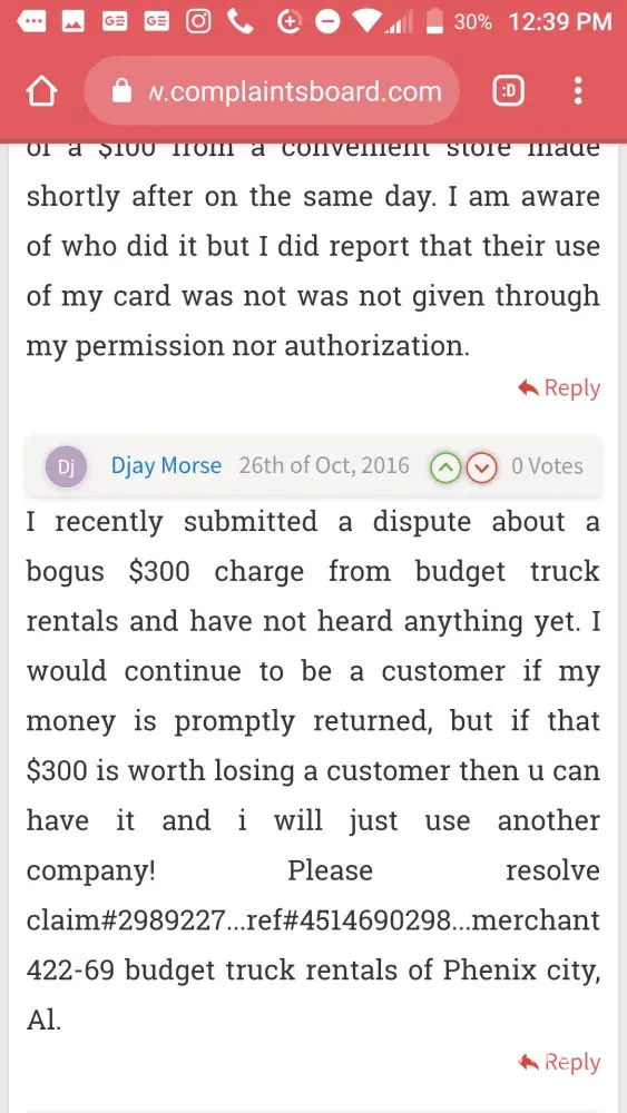 I recently submitted a dispute about a bogus $300 charge from budget truck rentals and have not heard anything yet. I would continue to be a customer if my money is promptly returned, but if that $300 is worth losing a customer then u can have it and i will just use another company! Please resolve claim#2989227...ref#[protected]...merchant 422-69 budget truck rentals of Phenix city, Al.