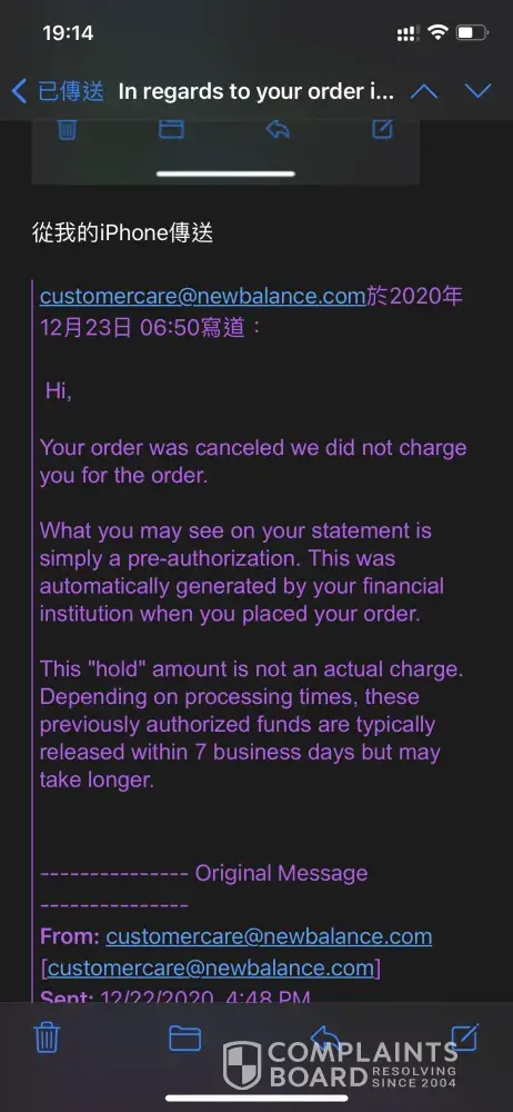 At the beginning, I go to NB website to buy the shoe"993", but after my paid ( 1st order no. NSE005025) I found I hadn't login my number account, since I want to get the bonus point, so I email their customer service, and then they told me the order was cancelled. So I tried to buy again, but unfortunately after my paid, I had found I bought the wrong size( 2nd Order no. NSE005332) it's for women, so I email them again to cancel the order. They told me the order was cancelled and will not charge on me. I think it's ok. Just terrible experience, but few days after, I found the NB company has charged on me for those orders. No any one order has cancelled. I am HongKonger, I need to pay 2 order fee and shipment fee finally...I m very disappointed and angry. However I had email their customer service but no replay anymore. Attached please find my email screenshot for your reference and further action. Thank you very much.