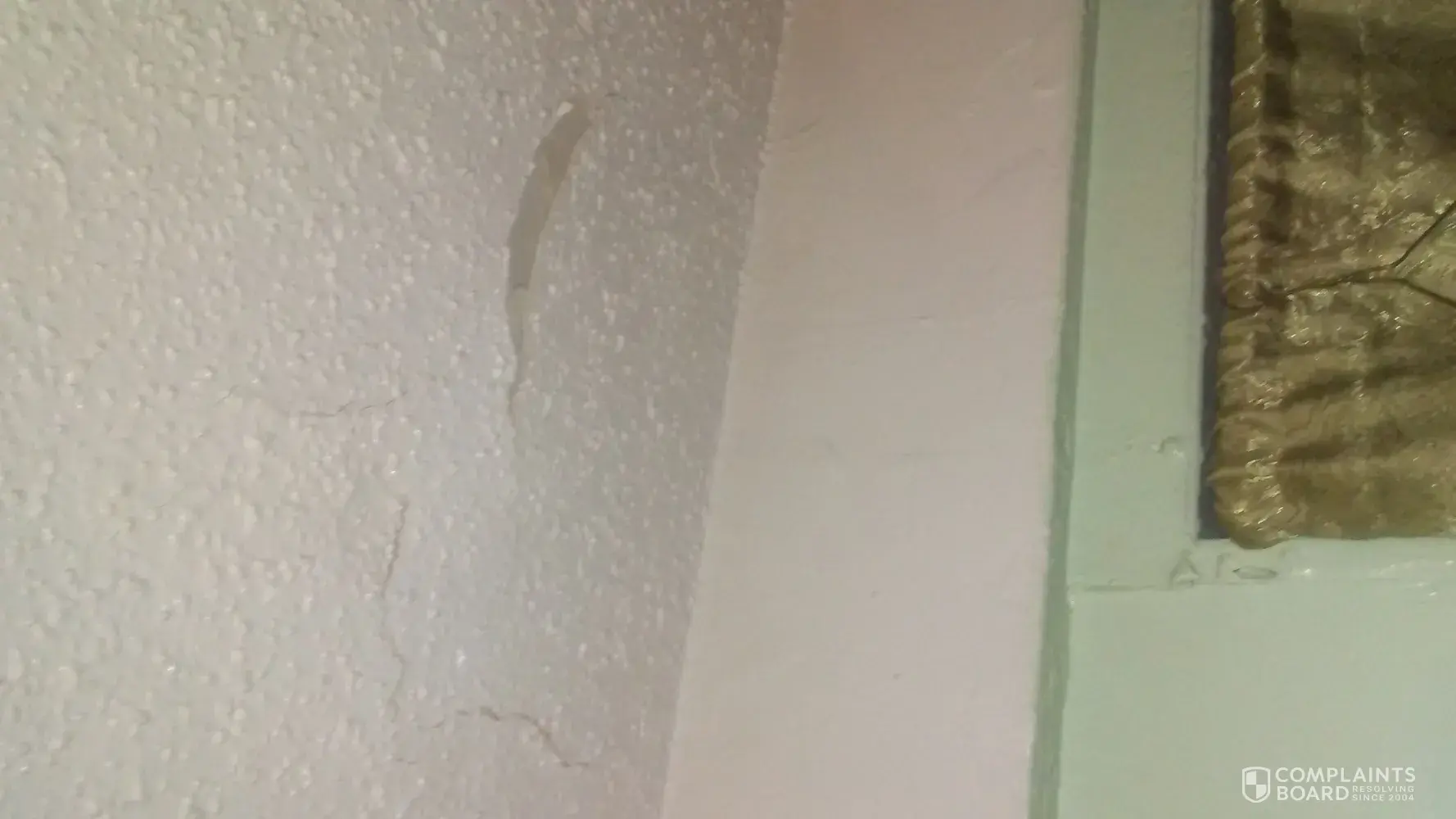 When it's rain the water that collects on roof comes into my bedroom through the walls and under the tiles. Floor tiles are cracked and has holes. Window pain has a hole, where small creatures (bugs) seep out from outside. Paint peeling and bubbling from access water build up. This has been going on for 3 years and main office knows the situation.
