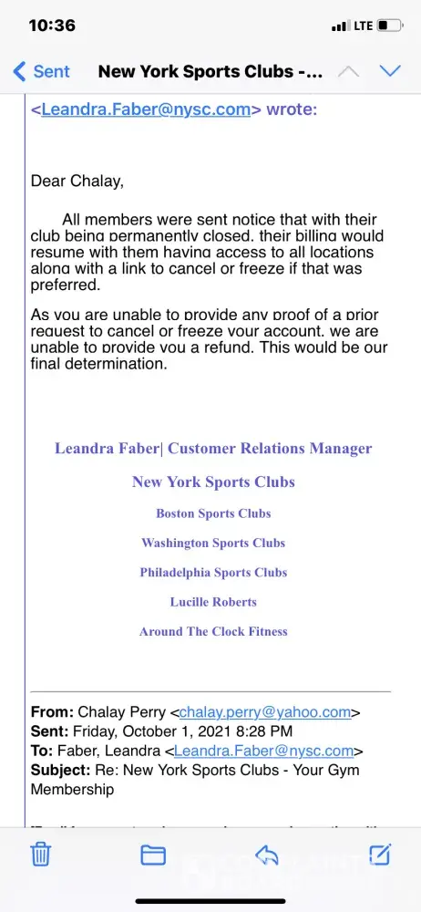 NYSC Varick Street Charging me a full year after receiving a cancellation letter from the Membership Consultant