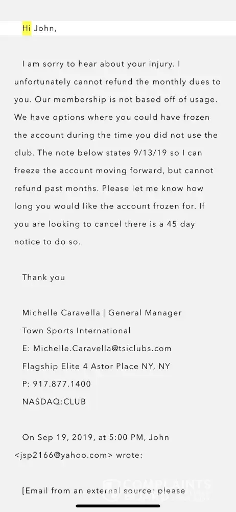I have tried calling the number online for corporate and will continue to but this is by far the worst customer service I have ever received. Not from Mario - but from this company. These issues and the denial of refund after the agreement of all of these managers and workers at the club is absolutely absurd and I don't even want to be part of this gym when all of these issues continue to reoccur and be wrongfully ignored on NYSC's part.