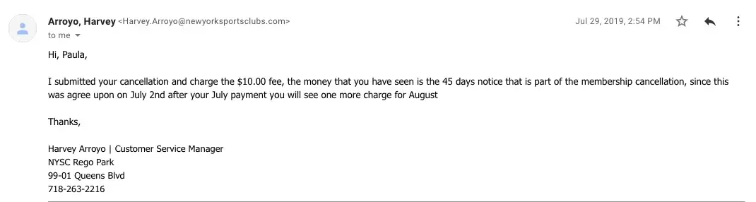 I joined NYSC at your 62nd Street location on Aug 23rd of 2018. My membership monthly rate was set at $79.99. In October of 2018 I broke my ankle (not at the gym). I called to put my membership on hold for 6 months and provided a Physicians note with my diagnosis. In April 2019, when my membership was about to start up again, I contacted the gym to tell them I had decided to cancel my membership and I sent them an email stating why and that I wanted to cancel immediately. I came in and signed a form stating that I was cancelling, the reason why etc. etc. Back in late July I noticed I was still be billed $79.99 a month. I went back in and told them what happened and of course there was no record of me coming in and filling out the form. So, I filled out another form and explained exactly my situation. I received an email receipt a few days later, with no explanation, showing that I was charged the $10 cancellation fee. Meanwhile this was supposed to happen back in April which means I should be reimbursed for May, June and July 2019.