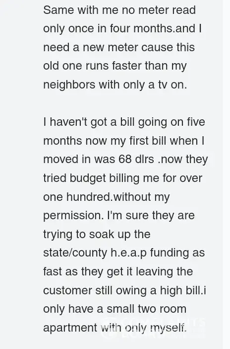 I haven't got a bill going on five months now my first bill when I moved in was 68 dlrs .now they tried budget billing me for over one hundred.without my permission. I'm sure they are trying to soak up the state/county h.e.a.p funding as fast as they get it leaving the customer still owing a high bill.i only have a small two room apartment with only myself.