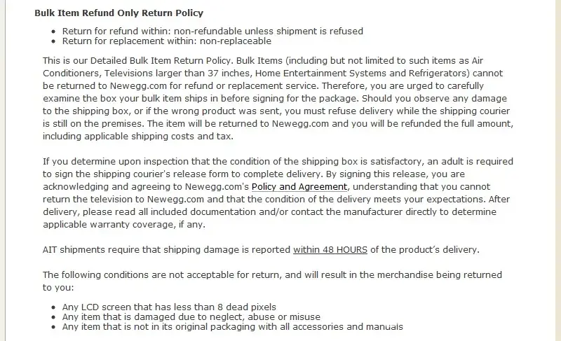 I figured, I would return the defective notebook for a replacement. Consider my dismay when I found out that newegg will not replace a notebook computer unless it has eight (8) or more dead pixels! I didn't remember reading that in the return policy so I decided to go back and read over the policy again. There was nothing in either of the two sections mentioned above that outlined newegg's dead pixel policy. Furthermore, I looked under various other sections not related to my purchase and found nothing until I came upon the"bulk item refund only return policy". Oddly enough, this section pertains to bulk items such as air conditioners, large televisions, home entertainment systems, refrigerators and other items that are non-returnable /non - replaceable. The dead-pixel policy is there, but it's hidden in a section not pertaining to personal computers at all! Furthermore, it's placed within a section that deals with items that can not be returned or exchanged for any reason, which makes even less sense! See the screenshots attached to this complaint for proof.