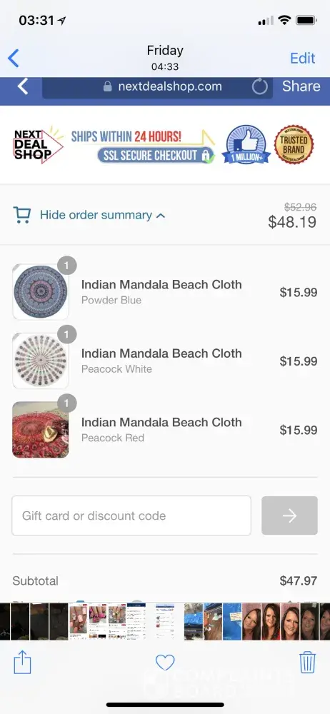 Ummm yes clearly NEXT DEAL SHOP deducted the money from my account in the same amount of the 3 towels purchased.