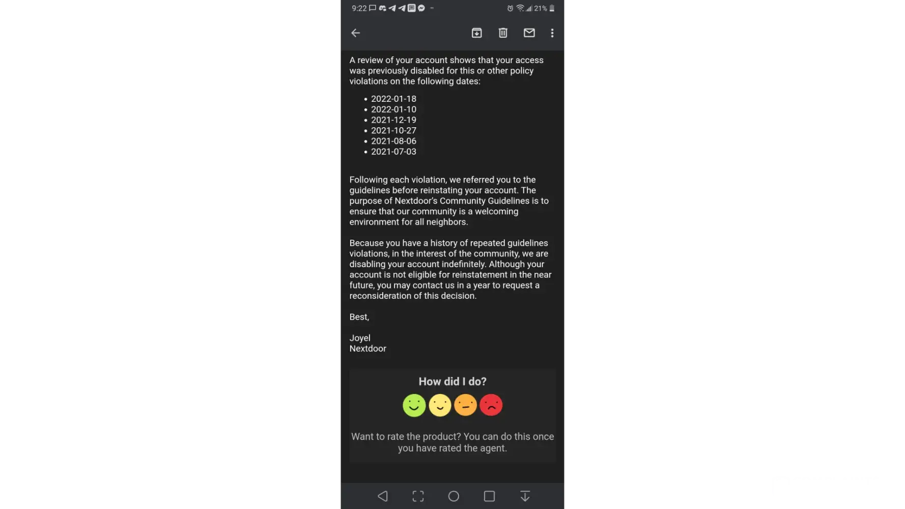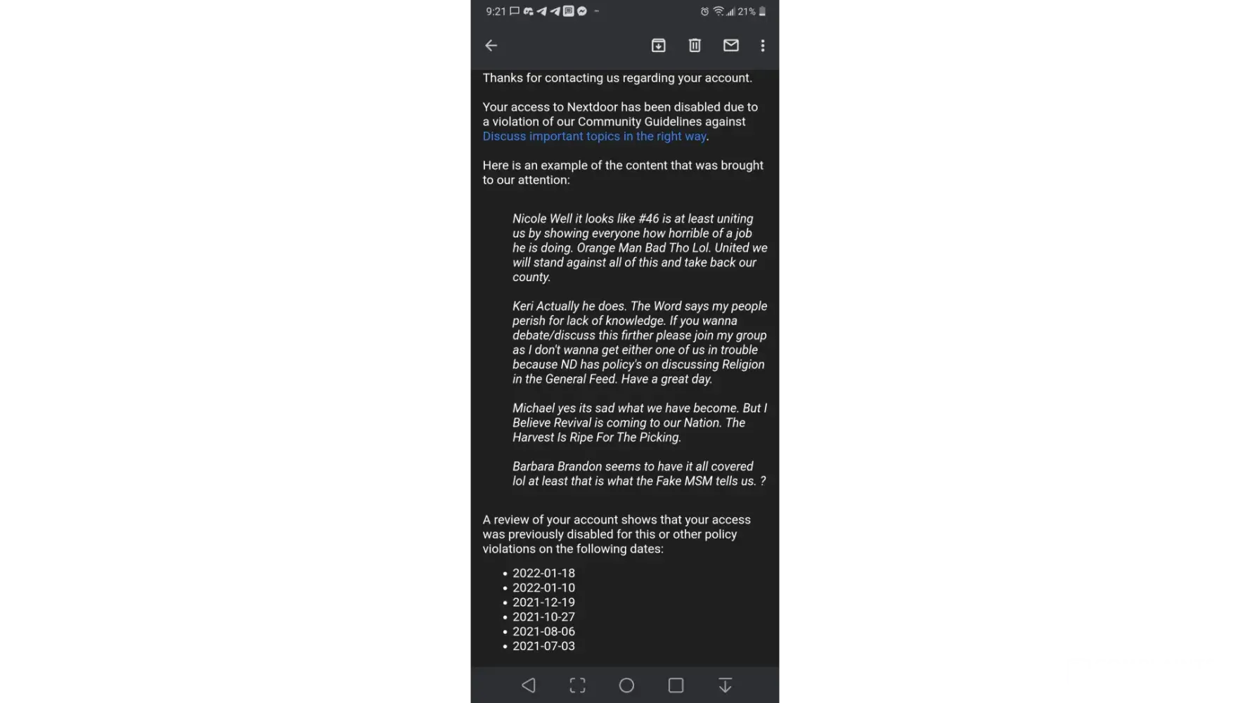 Your access to Nextdoor has been disabled due to a violation of our Community Guidelines against discrimination.