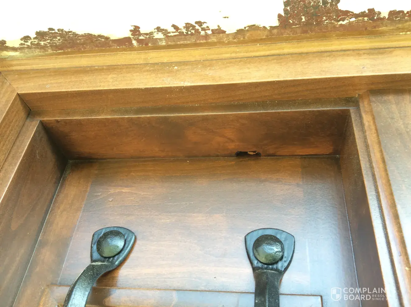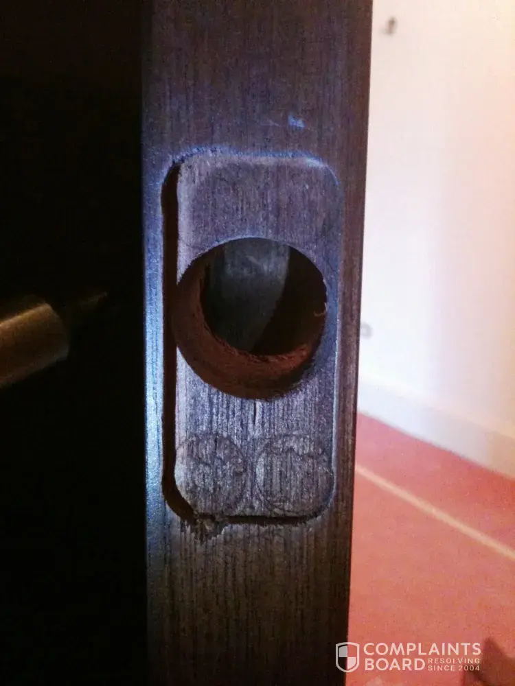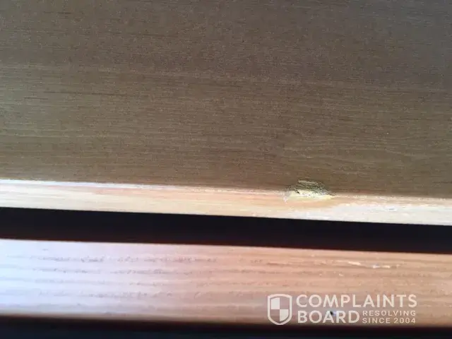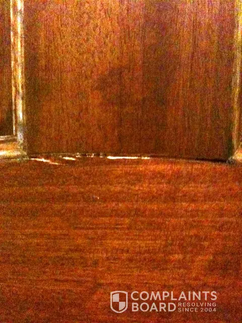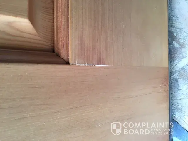 In addition, the door was of substandard quality with rough areas where it had not been properly sanded prior to staining and finishing. Also, there were small holes or gaps. Overall it was a poor quality prep and finish job.