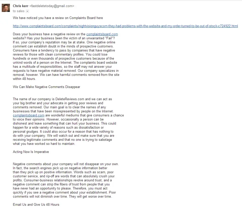 Note how easy it is to write something here. There is a scam going around that has been noted on several threads here. Somebody posts fake reviews and then emails businesses offering to remove them. The emails come from Chris Kerr claiming he works for deletereviews.com. This is low lever extortion scam. Clearly this does not say much good about the quality of content on ComplaitBoard.com if they don't do anything to keep these scammers out. here is another situation just like this: .