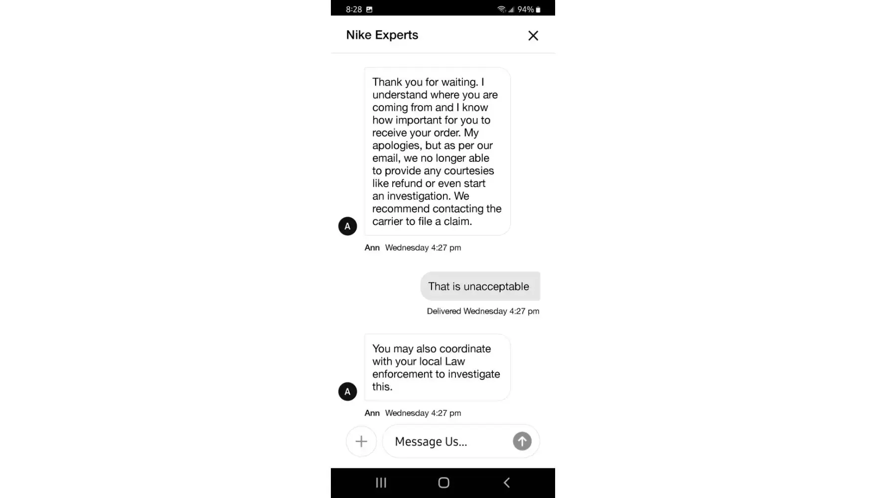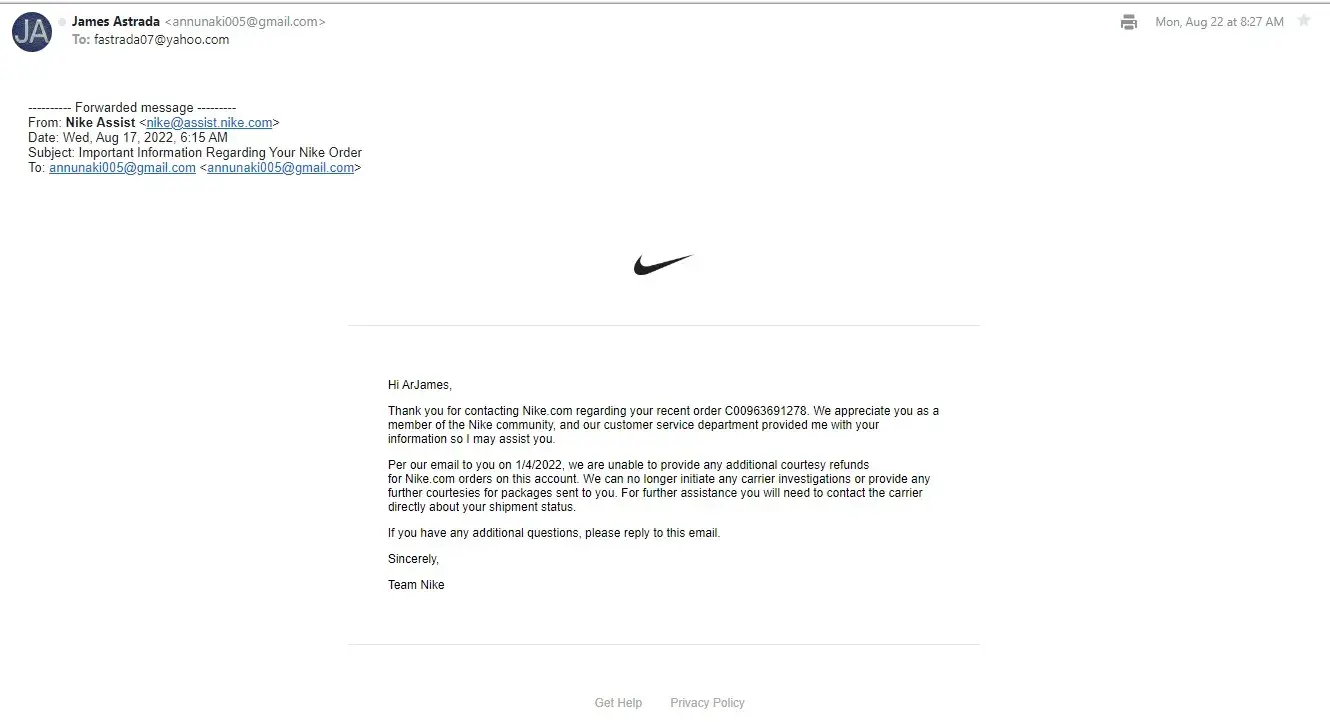 I ordered an item from Nike on 8/5/2022, and was never received. I tried reaching out however, customer service stated they were not able to assist and said the following. "We are unable to provide any additional courtesy refunds for Nike.com orders on this account. We can no longer initiate any carrier investigations or provide any further courtesies for packages sent to you. For further assistance you will need to contact the carrier directly about your shipment status." To suggest I want "courtesy" refunds is disrespectful and insulting. It is the responsibility of Nike to provide me with help to get this resolved. I spent 110 on this item and am not going to lose that. The order # is C00963691278.