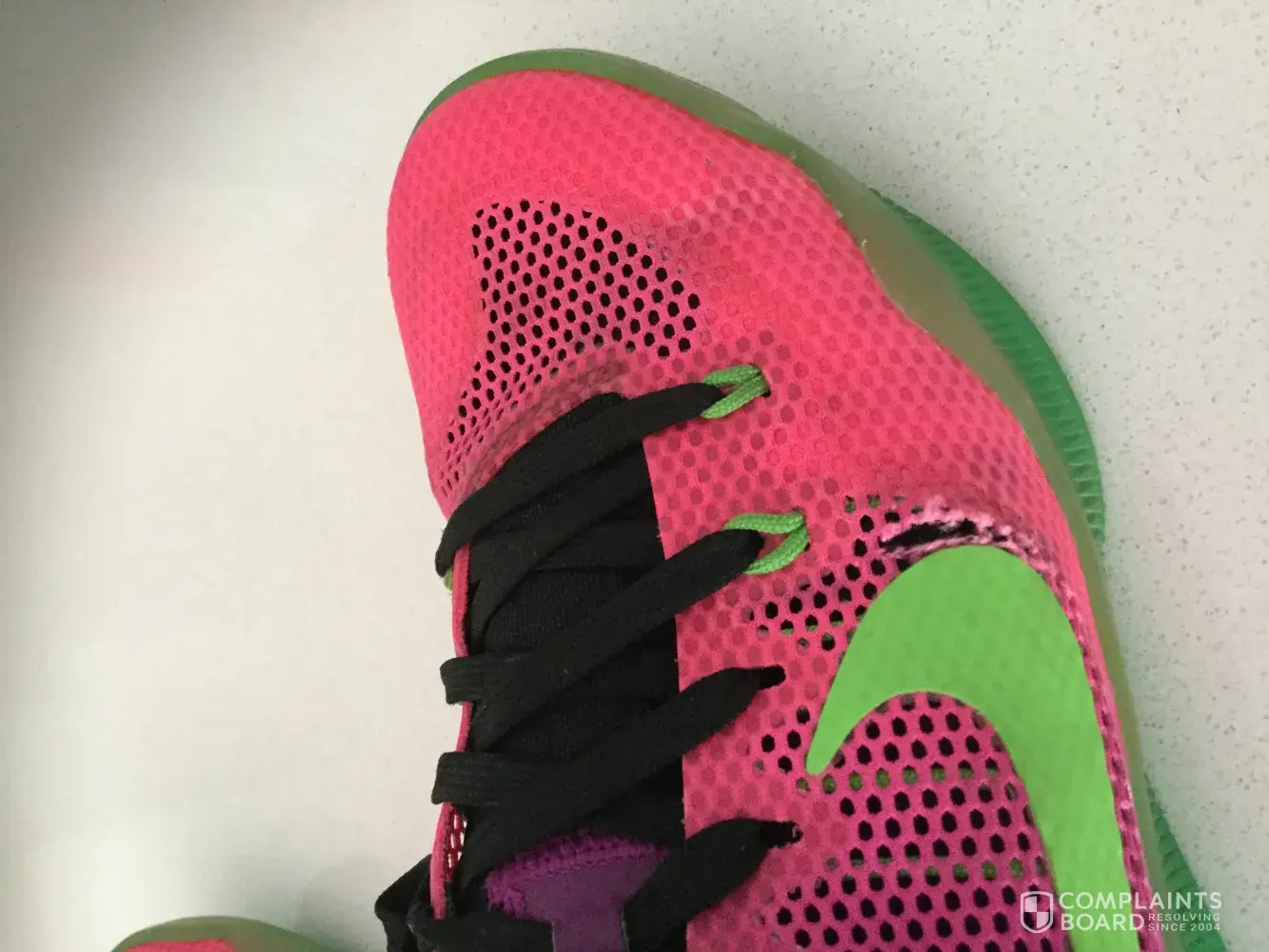 I purchased a pair of white Nike running shoes, size 10, for my daughter's birthday at the end of December 2016 from Dick's Sporting Goods. The number inside the tongue is [protected] VH. Within a few weeks the toe area began wearing away on the top of the shoe. There is now a hole above the big toe on both shoes. She wore socks while wearing the shoes.