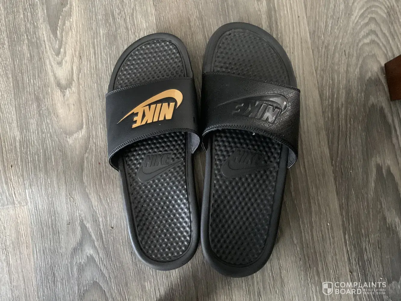 About 6 months ago I purchased a pair of black Nike slides with the Gold "NIKE" writing on it for my boyfriend. He always gets size 10 in the slides. He wears a 9 in regular shoes. So he makes sure to go a size up in slide to a size 10. When he tried to wear them they were so tight that he could barely squeeze his foot into it. We moved to another house and somehow that paid of slides got lost, (not like they fit anyways.) So last month after losing those, I decided to go buy another pair to replace those. The same exact pair, Black with the GOLD NIKE writing, and also bought an all black pair, both were a size 10. We were hoping that it was just a manufacturing error with the first pair we got. The all black pair size 10 fit perfectly fine, but the black with gold writing was still super tight and he can hardly fit his foot into them. I'm not sure why this keeps happening or if this slide in particular is just made a different way, but this is now the second time this has happened with the same exact shoe and it seems to only be this particular slide that does this, and I hate that we have wasted money twice on them. He loves his NIKE slides. hopefully you can assist.