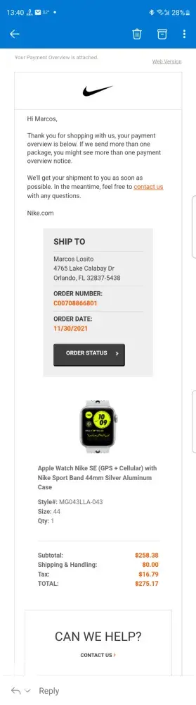 I've ordered the Nike Apple Watch SE 44mm (GPS+Cellular) through order C00708866801, on November 30th, 2021.