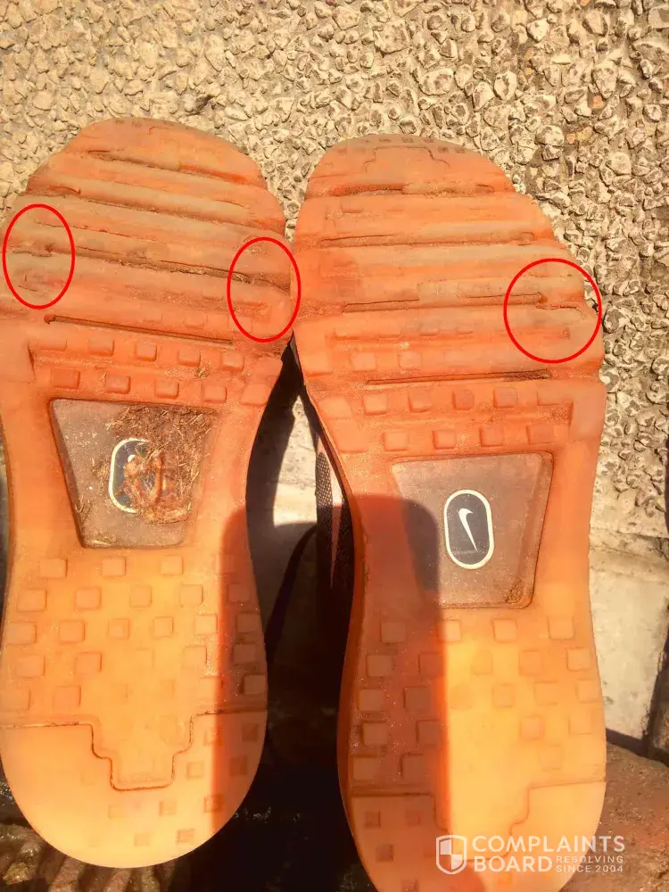 You could technically write a few emails to them ( http://www.nike.com/renov/nikestore/us/v1/us/en/info/help.jsp ), or even do a live chat with an agent, and patiently wait for a response - or better yet, a resolution. If you don't get the same world-class customer service treatment as what their prices look like, then contact the BBB. A faulty product is not only a terrible matter in itself, but it's also a major safety issue for the user. If they don't do anything about it then advertise this situation on any social sites, maybe even make a video of your issue and post it on youtube! Drag those dirt-bags through the same mud they are dragging you through now!