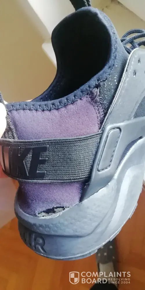 I have purchased nike shoes not even a year ago. After a month there was a detail like a small hole, but i did not complain on this since I never do this kind of things. Today I have noticed another hole on the back of the shoe where the shoe material is glued for the trainer. I am really careful with trainers and take a great care for all of my shoes.