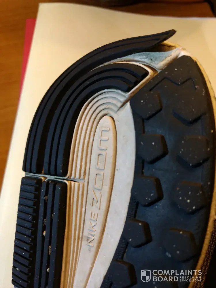 I was provided two pairs of NIKE shoes last Christmas and my birthday by my wife. she purchased them at the Nike store in the local outlet store on Ridgewalk Outlets in Woodstock Ga. I am 61 years old and should not be considered anytype of risk to wearing out shoes. What has happened to both pairs, One is a Nike Zoom Pegasus 34 size 11 and other one Dual Fusion TR11 size 11, is that the glue that holds the bottom parts together is either pooly applied or not enough was done during the manufacturing process.