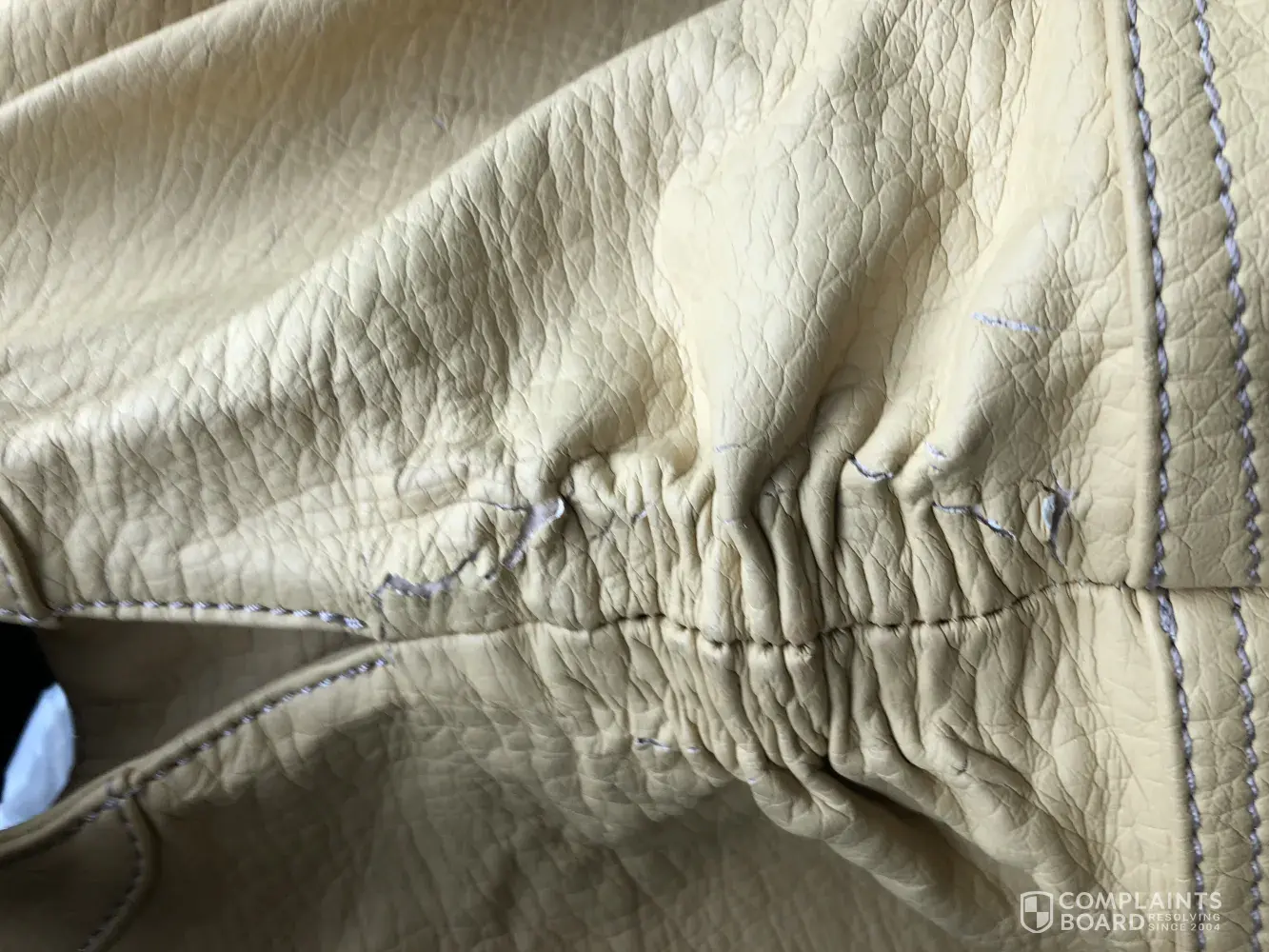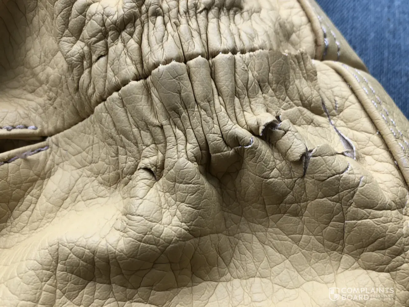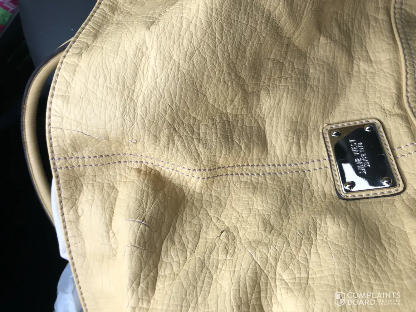 I am having the same exact concern about a bag that looks to be the same judging by the pictures above. I have a brand new white, blue, and light blue tote bag that i have only used since the beginning of September and the one side of the strap completely broke off.