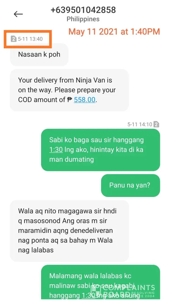 I got a text message from ninja van this his phone number, 09958173369. He said that I will meet him in Morong Bataan. Poor customer service. Its a COD (cash on delivery) why am I going to meet him in Morong when my place is Bagac, Bataan.