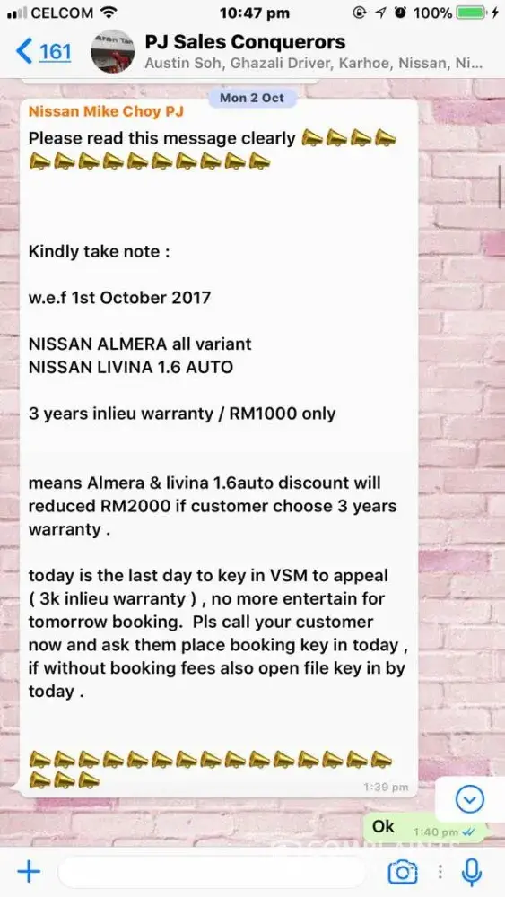 I'm would like to inform your since last week sunday 15th Oct 2017, I call up to your hq to make a complaints case issue regarding about discount issue at pj branch ss13 showroom, sales order customer name (tan ngok eng) and (tiong kek ping) both of this owner order one unit Nissan Almera vl spec and one unit Nissan Almera e spec! Since Monday your hq got a person call me back and answers me will be investigated this case and will let me know result by Tuesday 17th October 2017! Even still pending also will let me know! But I ot have received any calls by your hq department person and also just received call by your this branch manager ss13 name call (mike choy)! He call up to tell me just only can help for appeal back a rm500! Since this case when I booked the first unit on 2th Oct 2017, owner name (tan ngok eng), got a sales advisor call to me name (Isabelle ho) also refferal by his branch manager (mike choy) order her to tell my customers nissan Almera this model will be the last day offer discount by 9.5k! The reason is tcmhb will be suddenly announced for revising 2k by tomorrow 3th Oct 2017 then become my customer need to get this discount 9.5k to avoid the revising less 2k discount, and also my customer go to do all the documents needed and a booking fees for key in system! Second units owner (tiong kek ping) also is me confirmation to order by late a bit around 8-10th Oct 2017, some more customer also said if this second units also will be can appeal by same discount 9.5k then customer only confirm to buy second units! Since im a third party person as a broker to do this report complaints also by this case for help (tcmhb) nissan brand about this case issue problem and help your hiding my customers all the problem about the discount will can't follow by the day promised 9.5k! Since I had a heart tof kindly to help this problem for avoid to let cusfomer knew! End up last week Saturday 14th October 2017 when I go for the event at pj ss13, suddenly told me can, t give anymore by both of this 2units car and also got a person name (John foong) to tell me all the rubbish reason by the issue happen out also because of this branch manager ss13 no have inform him and very no responsibility to inform him (John foong) about your internal issue for plan key in order by my case (rebook issue) become no more about the discount when become me also don know this orderc cancel nu as they And still without my customer approval! More funnty is yesterday 17th Oct 2017 the branch manger told me can't get back the discount anymore?! And also I got some text can proof that alll also become your ss13 branch manager (mike choy) to promised at all discount to his staff sales advisor! Some more still want tell me again don't trust about his head of religion manager John foong on the day event last week Saturday at ss13 showroom about issue happen cant appeal also because branch manager (mike choy) do the rebook without him permission and become my customer both of this units almera can't get back anymore about discount 9.5k, and yesterday 17th Oct 2017 afternoon the ss13 (mike choy) branch manager ask me please don't trust John foong said anythings on the day events about that issue effect my first unit rebook! Come on please la, I really don't how to trust your staff (tcmhb) anymore and also they position so call a leader and head also! I not have so much times play with your this all issue and waste my time become fraud my customer! Since your staff want to treat my customer like that and not have responsibly to call up customer to settle, then I just can tell (tcmhb), this all story me will be inform my customer soon and your just get a ready to solve this all [censor]! As long as I knew, dato tan eng chew won't be deal a business become like this and also break promised to giving! Worst come worst I also will report to japan side nissan if your never take any action to this case! By the way I'm as broker third party to make this report complaints because of customer got sick of strock
