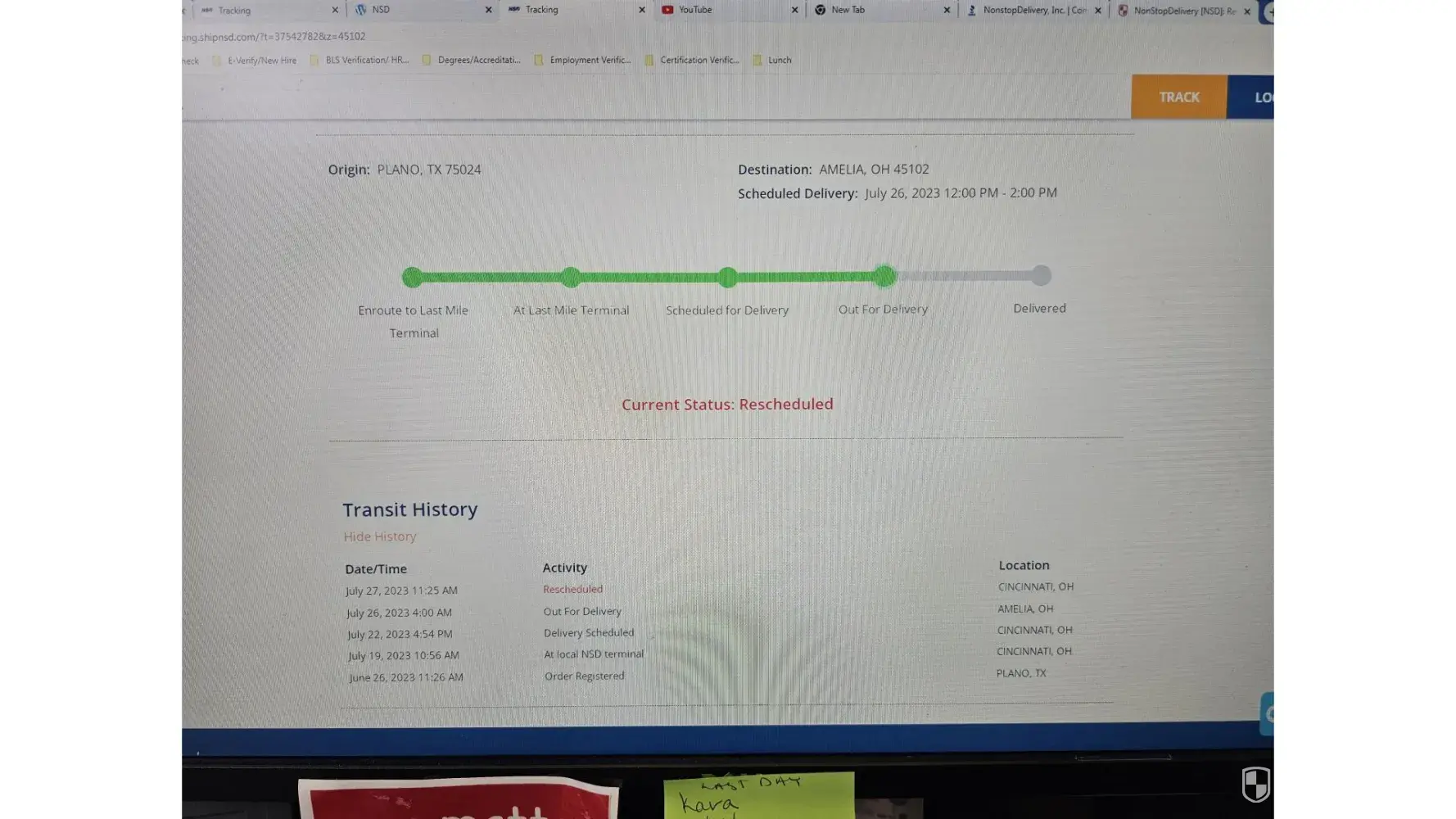 Ordered a sink top on July 18, 2023. It left Weslaco, TX on the 20th and arrived in Cincinnati on July 21 at NSD warehouse. On July 26, they posted it was out for deliver and would be delivered between 8:00 and 12:00. No show, No call.