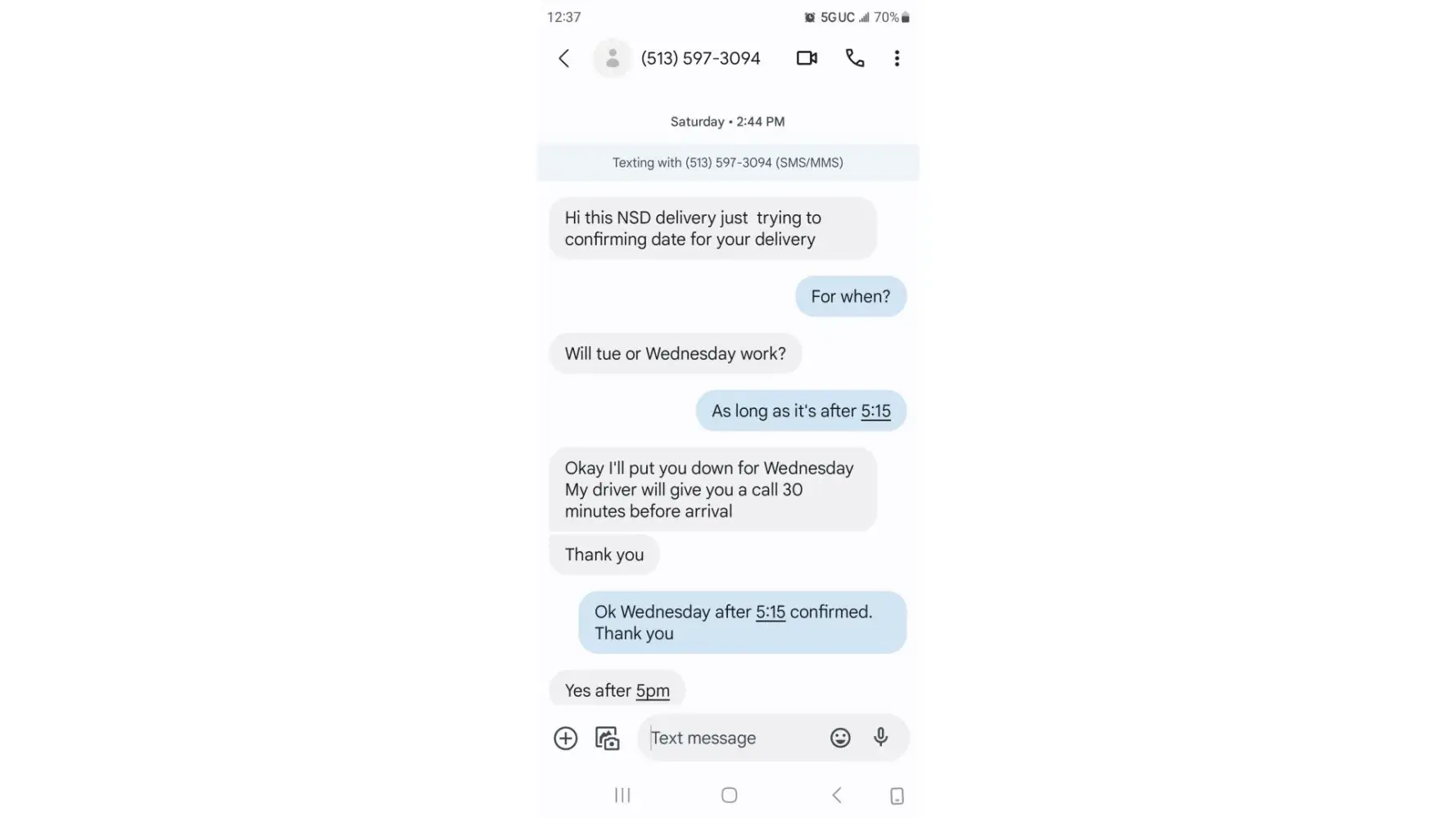 Desired outcome: A phone call when it will be delivered and delivered when promised.