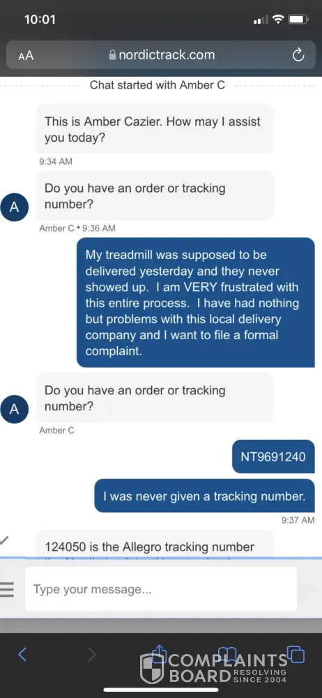 I ordered a treadmill directly through NordicTrack.com on 11/7/2021. The item was shipped to the local delivery company and arrived on 11/20/2021. I was told within a few days someone would call me to schedule delivery. After two weeks I contacted NordicTrack and they again just said someone will contact you in a few days. Another week went by and no one contacted me. Then NordicTrack asked me to review my treadmill so I gave it a poor review. Within a few hours of that I received an email link to schedule my delivery. I attempted multiple times to schedule online but it continuously gave me an error message ever time I selected a date. I finally was able to successfully schedule delivery for January 4, 2022. The night before the scheduled delivery I received an email that said my treadmill was scheduled to be delivered between midnight 1/4 through midnight 1/5. I waited all day. I had to take off work so I could be home for this threshold delivery. I even called the delivery company to confirm delivery was scheduled and what time frame. He said it should be scheduled between 8:00 am and 7:00 pm. I never received it. Over the next several days I have attempted to contact both the delivery company and NordicTrack via online chat, telephone, and email to get answers and reschedule delivery and they keep giving me the run around. No one will answer my questions. No one will reschedule me when I call. They just keep telling me they have expedited my complaint and someone else will call to reschedule "shortly". It has been two days without anyone calling me back.