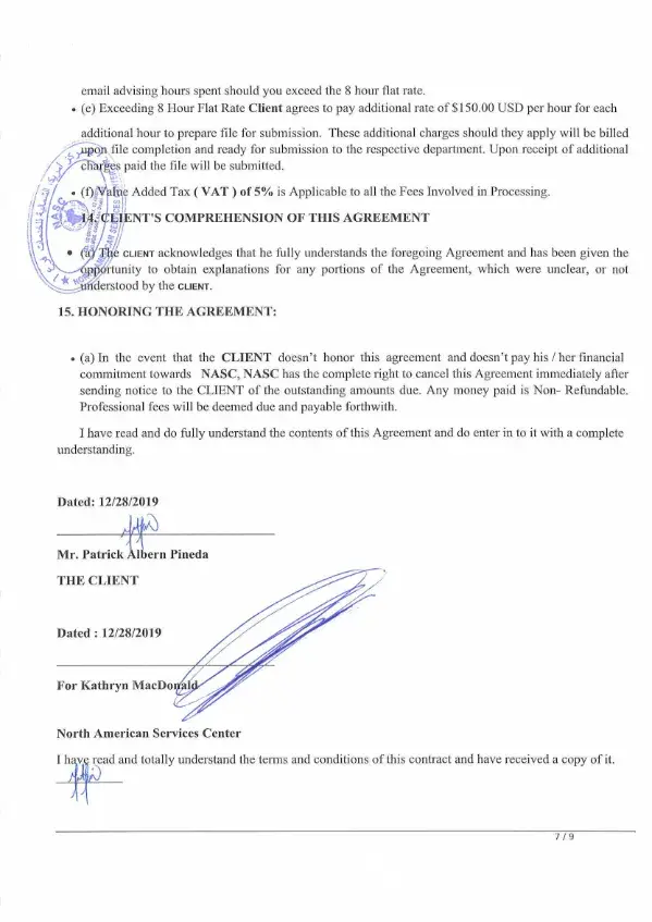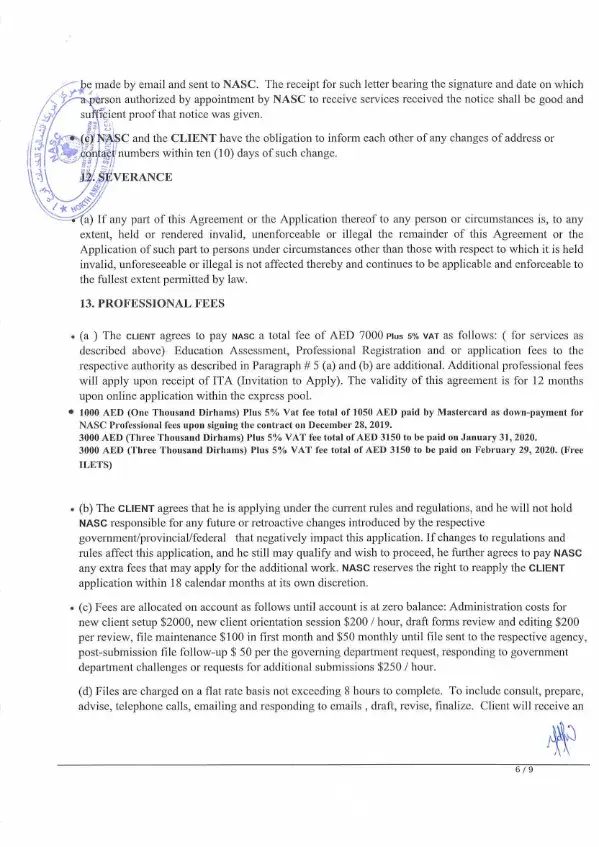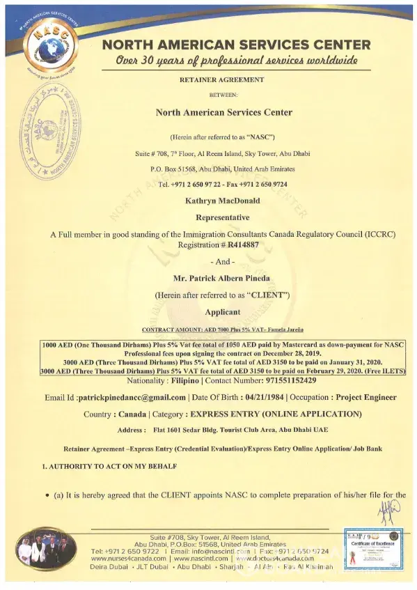I entered to a binding contract with NASC dated 28-Dec-2019 to process and help to secure a Permanent Residency for Canada for myself. However, after fulfilling all the requirements (i.e., Educational Credentials Assessed World Education Services - WES, Completion of IELTS Exams with 6.5 Band Score, and all other document requirement). Up to this date, nothing has been achieved from NASC in securing the Permanent Residency Visa for me. Please support in refunding my money since they are unable to deliver results and this is a clear indication of breach of contract.