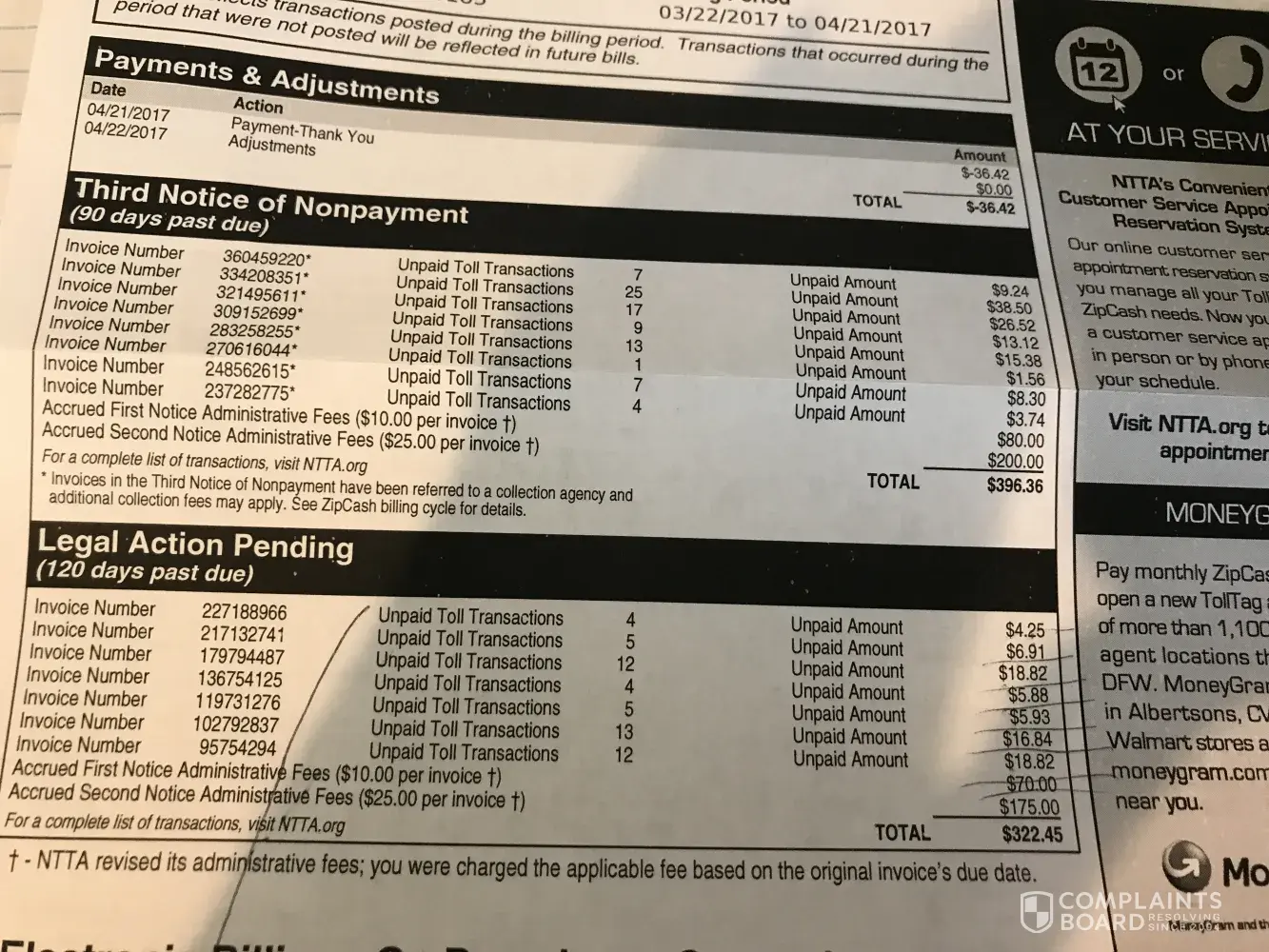 I received a zip cash toll bill /3rd notice of non payment detail this past week in the mail. The billing period says 3/22/17 to 4/21/17 and the column under legal action said invoice number [protected] unpaid amount 4.25 invoice number [protected] unpaid amount 6.91 invoice number [protected] 18.82 invoice number [protected] unpaid amount 5.88 now granted there are other invoices on this statement that was sent if you look under my account. I called today to pay these I had listed and was told by a very RUDE customer service representative Terrell at 10:55 am on 5/8/17 that these had all went to collections and all had administrative fees. Now if you notice about the billing statement was 3/22 to 4/21/ 17 and I just received it so how the heck would it have went to collections and administrative fees already been added I tried to explain this to Terrell the rep all he said was would you like to pay an invoice and which one. He was not acknowledging anything I had to say so I requested to speak to a supervisor then I was told that due to high call voulume he was told to say one would call back in 24 hours that I couldn't talk to one right now. I feel like this whole tollway is a SCAM I am trying to do the right thing and pay but every time I call I am told something totally different that I owe versus what the tollway sends me an invoice for which by the way like I said and what billing statement date also says was received so it should be accurate but it is not. I demand some type of assistance with this before I have to take it higher to an attorney or news or whatever I have to do because the tollway customer service is by no means trying to assist me and I am fed up with it. I have an autistic daughter, I work full time trying to take care of her and my other child and my sick mother I have no time for nonsense like this. Please help !