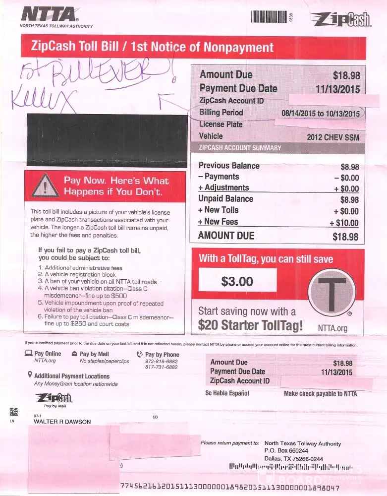 The first invoice I received for using George Bush Turnpike was a 2nd notice of non-payment. I never received a payment invoice, nor did I ever receive a first notice of non-payment. I spoke with a man on the phone who said he showed they did send out two previous invoices. That is either blatantly a lie, or it's just wildly coincidental that my post man is 0 for 2 with only NTTA's bills. Funny no one else seems to have a problem getting their bills to me. NTTA are nothing short of crooks and thieves. Period. There should be laws against theft but evidently it's okay to steal here in the U.S. Maybe I too should begin looking into a job where I can just steal from others and not have to actually work. Seems to be the easiest way to make a living. I'm supposed to be receiving a supervisor call in the next 48 hours to discuss the issue. Also, I noticed many people were reimbursed earlier this year in a statement from NTTA for issues exactly like mine. If they are reimbursed and I am told I cannot be, would that be discrimination?