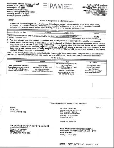 A week later I got a past-due notice and late fee assessment, claiming either non-payment or pmt after due date. I contacted NTTA by email (Always by mail/email so there's a record). They wanted a cancelled check. Since I paid with an electronic check I asked if my statement would do. They told me to send what I had. I downloaded a pdf of my bank statement with the date the check cleared, AND front and back of the digital check. I even wrote the bank asking them to confirm the date my payment was considered "cleared" and they confirmed that it was PAID ON TIME.