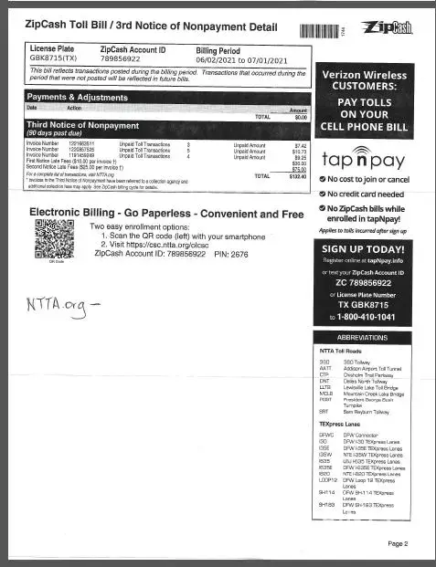 I need the NTTA to cancel this bill immediately. Zip cash account ID: [protected]