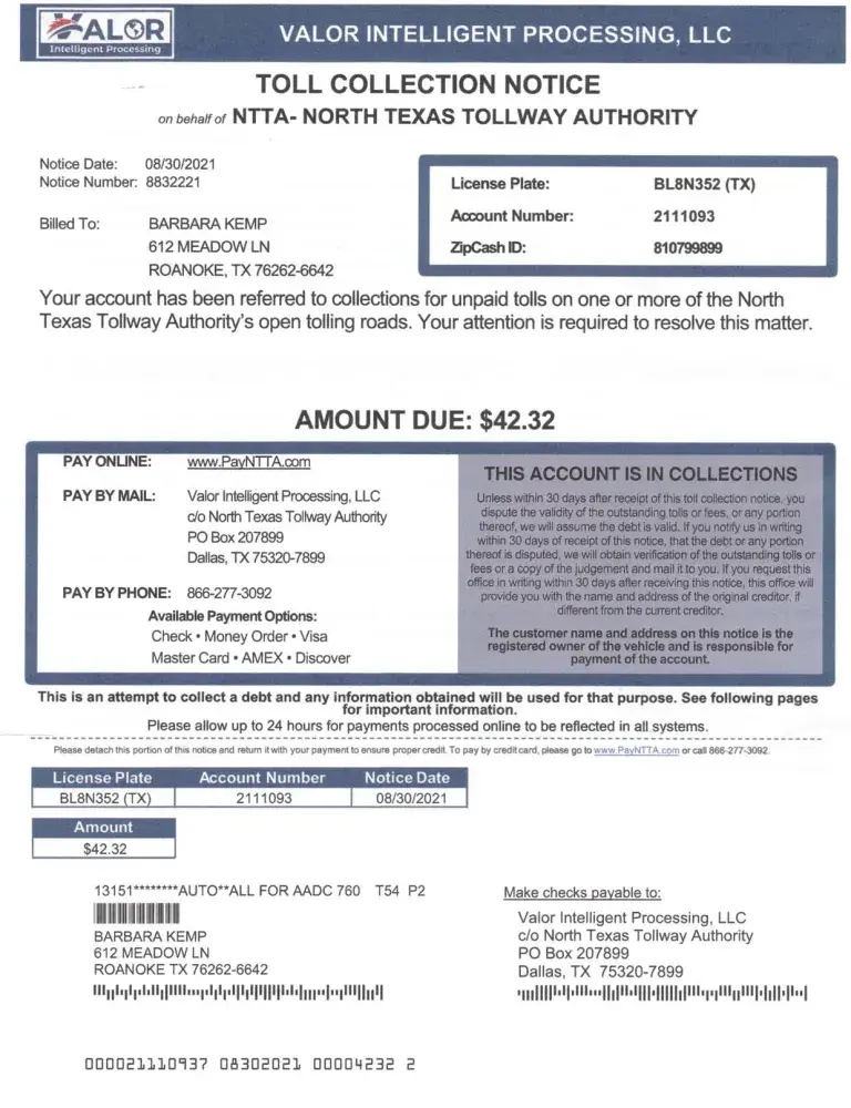 Today I received another bill from NTTA threatening fees, bans, blocks, and multiple misdemeanor citations, and also a collection notice from Valor Intelligent Processing.