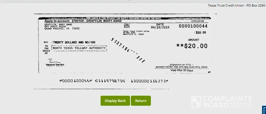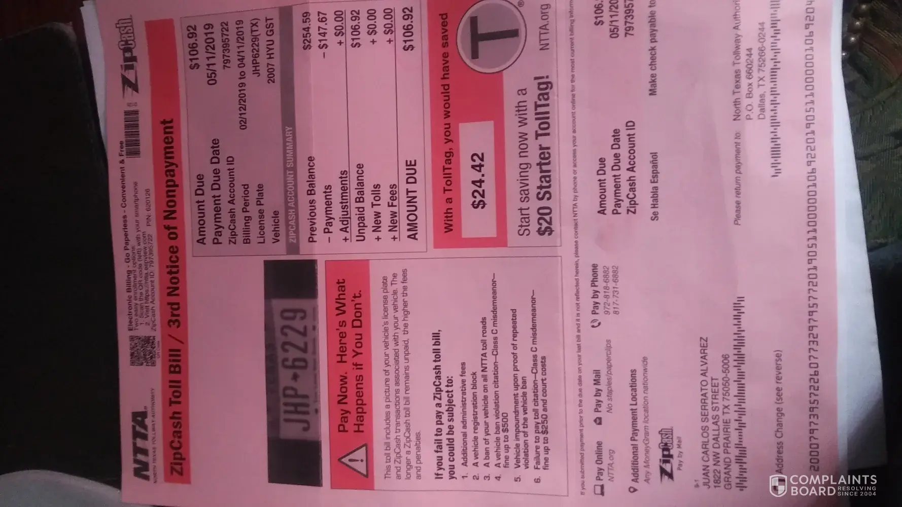 Invoice # [protected] - i received a bill from zip cash on in april 2019, bill was due on 5/3/19. I paid it through my bank on april 19th. I have the check going through well fargo bank way before 5/3/19. The bill was $18.09, i made the check for 20.00 (i was at work and couldn't remember the exact amount, so i over paid). For some reason, ntta got the check and applied it to my toll tag account(closed by ntta 3 years earlier, i got a letter telling me they were having trouble with the credit card). So this week i got a failure to pay 1st notice. I thought this would be a real easy problem to resolve, seeing as though i paid before it was due, and over the amount due.