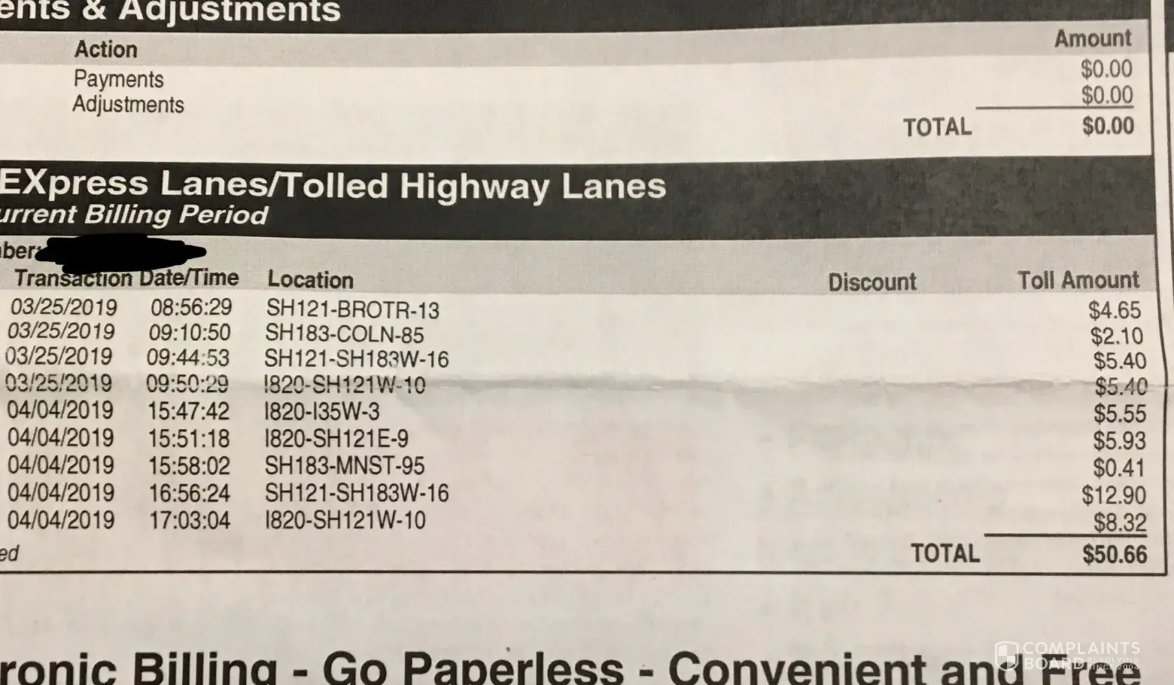 I was charged $50.66 (current, no late fees, for approx 20 minutes encompassing a total of two days, 3/25 & 4/04, of which I drove from Azle area to DFW and back. On 3/25 I/2019, I took my husband to the airport, dropped him off, and drove back home (from Azle to DFW and back). I was charged $17.55 plus about a dollar at the airport toll-booth. On 04/04, I drove to the airport to pick my husband up, waited for him to get through customs, then drove back home. The $12.90 on 4/04 was actually the time I was inside the airport, by which I paid at the exit toll-booth, as usual, only it was $3. For that day trip I was charged $33.11, plus the $3 at the airport. The exit to the airport was detoured to another exit due to construction.