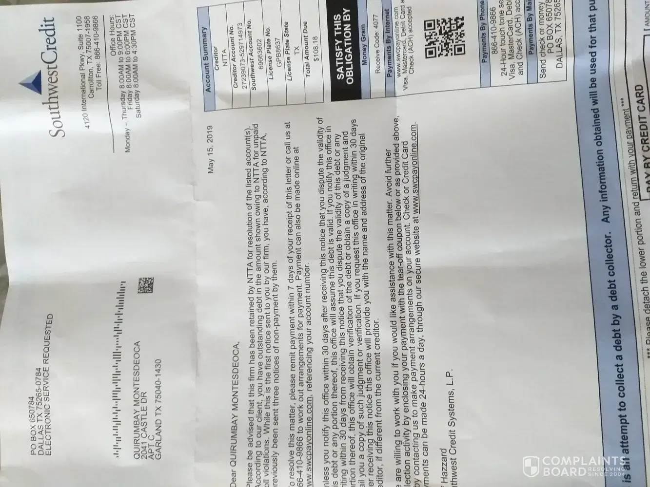 Before yesterday I received a letter, from sourhwest credit giving me 20 days to submit a payment of $104, due to a debt using ntta services, the letter says I was warned three times asking for payments, but curiously this notice awoke my desire to find answers, why, ntta is keeping doing this? Why I receive a letter from a collector company. And not a single letter from ntta asking for a payment, why.? This is the second time happening to me this year, with my other car jdd 6004 but this time was a single 3er notification letter of 89 dollars including all penalties. I called and asked, where were sent the other first two letters. The operator gave me another location where I used to lived. I tried to make them understand if it is fair to pay penalties for a debt without knowing of such existence... Because I do always avoid using toll freeways, can't remember having used one, but in case of happening such circumstances ntta send collection letters, but how to pay if you don't receive a single one, just a third letter with all penalties accumulated, finally I had to gift that money, people like me who avoid tolls are people who really struggle to make money for a simple debt of couple bucks, somebody must pay 45 times that bebt. Hope one day somebody see this corrupted system and fixed, but meanwhile I must appeal to this system. Now is my truck license plate gpb8637 same thing the only difference is that this letter came from southwest credit. Asking for 104 bucks, but a single one from ntta, I don't know if I wasting my time, I hope someone can help,