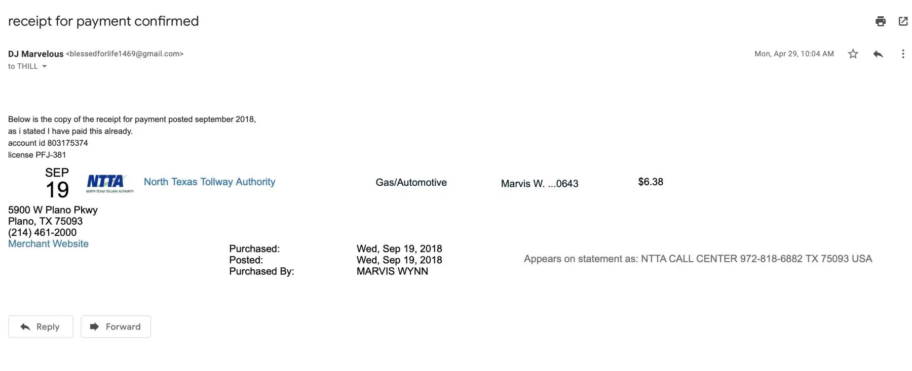 I have emailed this receipt to Ms T Hall Supervisor at NTTA customer service in Plano Tx, and I was told that the matter was settled.