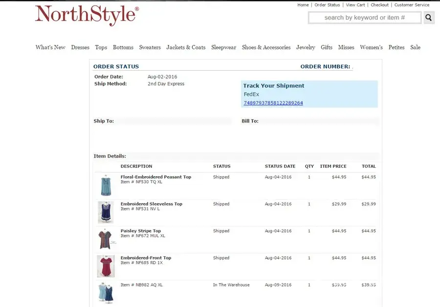 North Style did not appear to be very customer friendly nor does it appear that they do any type of tracking, because she couldn't even say whether the items had been actually shipped-and that was 20 days after the order.