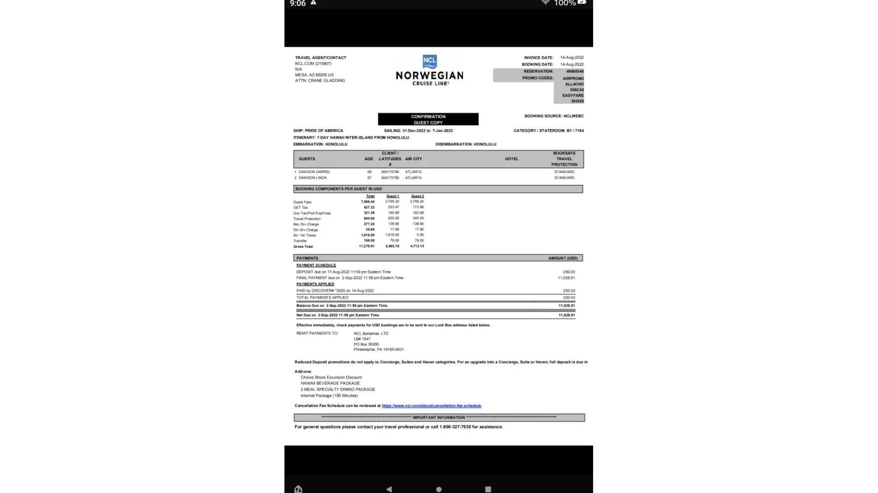 NCL arranged for our airline transportation. Had I arranged it myself I would have taken a straight-through flight, not one with a stop. We have two cruises scheduled for 2023, We will cancel both. WE WILL NOT TRAVEL WITH NCL AGAIN.