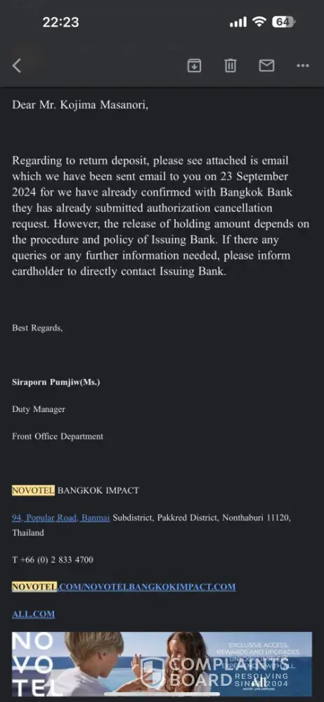 I will contact you because I didn't find better contact details to be in contact with Novotel management.