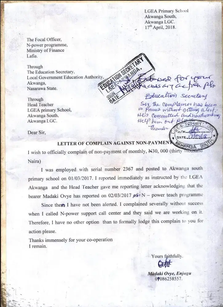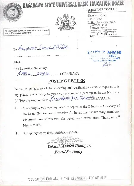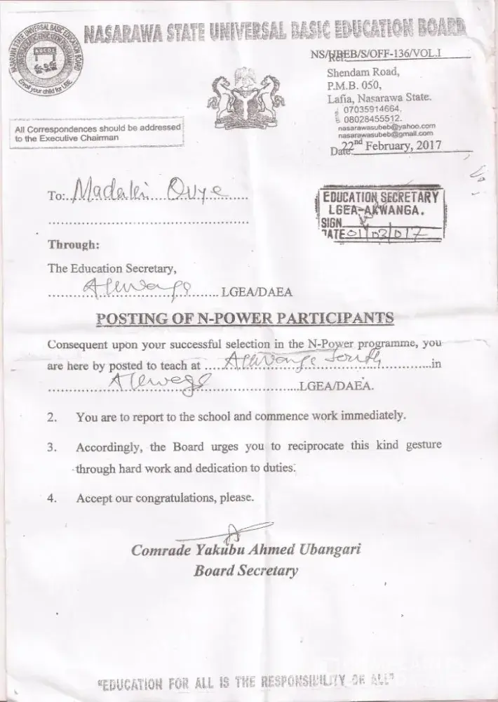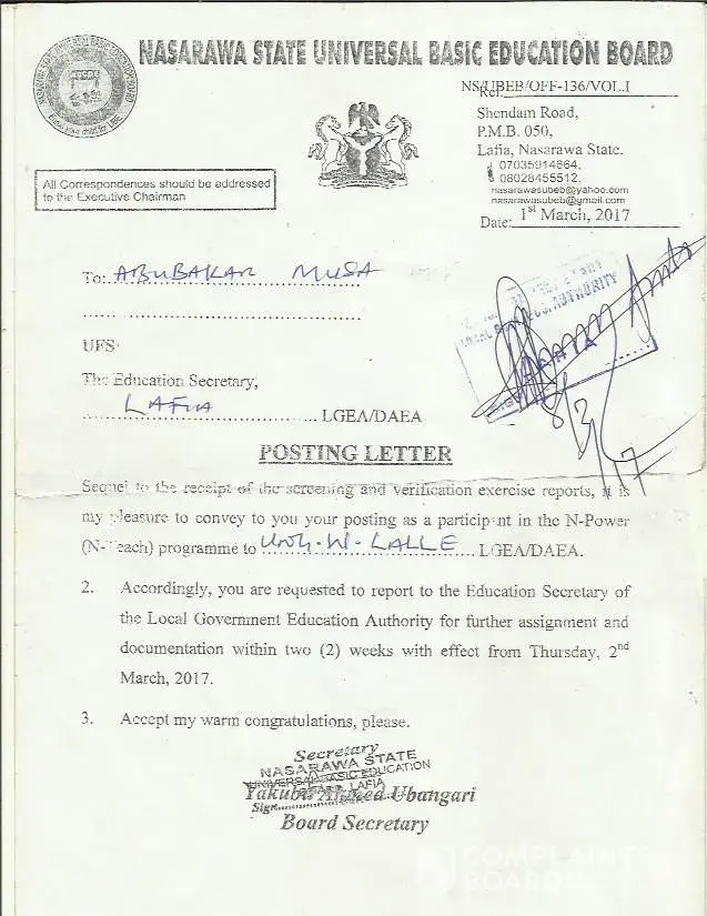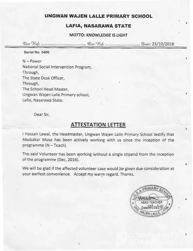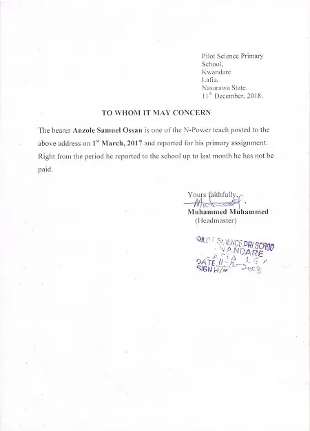 We were selected and posted to our lgea primary school on the month of Nov/2016 and we collect our posted letter on 1st March 2017, we reported immediately as instructed by the lgea primary school education secretary and we are verify; all the verification that took place in the state we are there for verify, we complaint severally without success, when we called n-power support call centre, they said they are working on it, even the last verification that took place on 15-17 december, 2018 at ministry for local government and chieftaincy affair lafia they collect our bvn validation portal and national identification number slip (nin) all middle belt. we are there. we've our attestation letter giving to us by our head teacher. therefore we have no other option than to formally lodge these complain to you for action please.