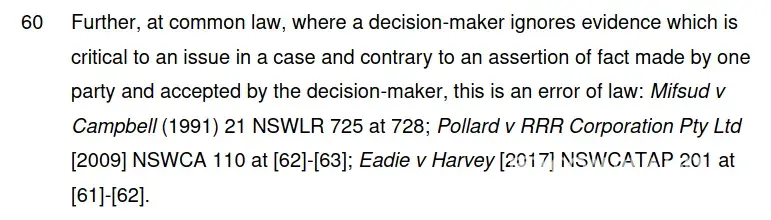 4. In NCAT case Ashlin-v-The-Owners-Strata-Plan-No-[protected]-NSWCATAP-413-21-December-2021 he highlighted problems with ignoring evidence.