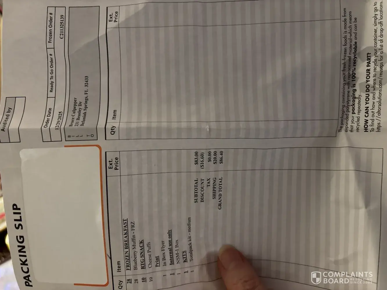 Read full complaintI am complaining about receiving the wrong order and two prior shipments and then receiving frozen blueberry muffins in this last shipment