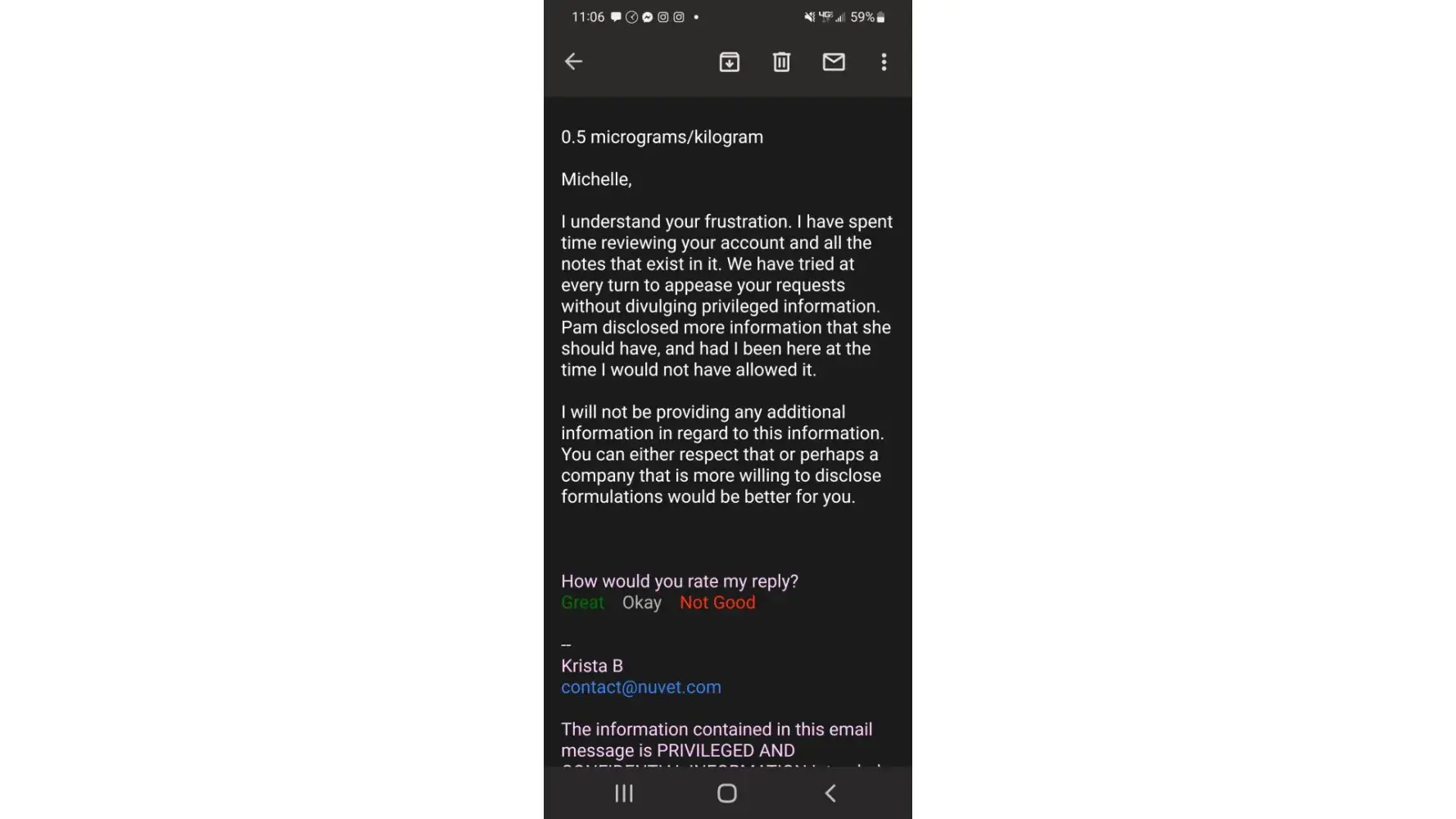 Her response is below, basically telling me to find another company to buy from. I didn't ask for proprietary info, just which blue green algae they used and what toxins they tested for as they all produce different toxins. These toxins are measured in micrograms per gram, not kilogram. I've worked with 2 groups of scientists on this for 3 years.