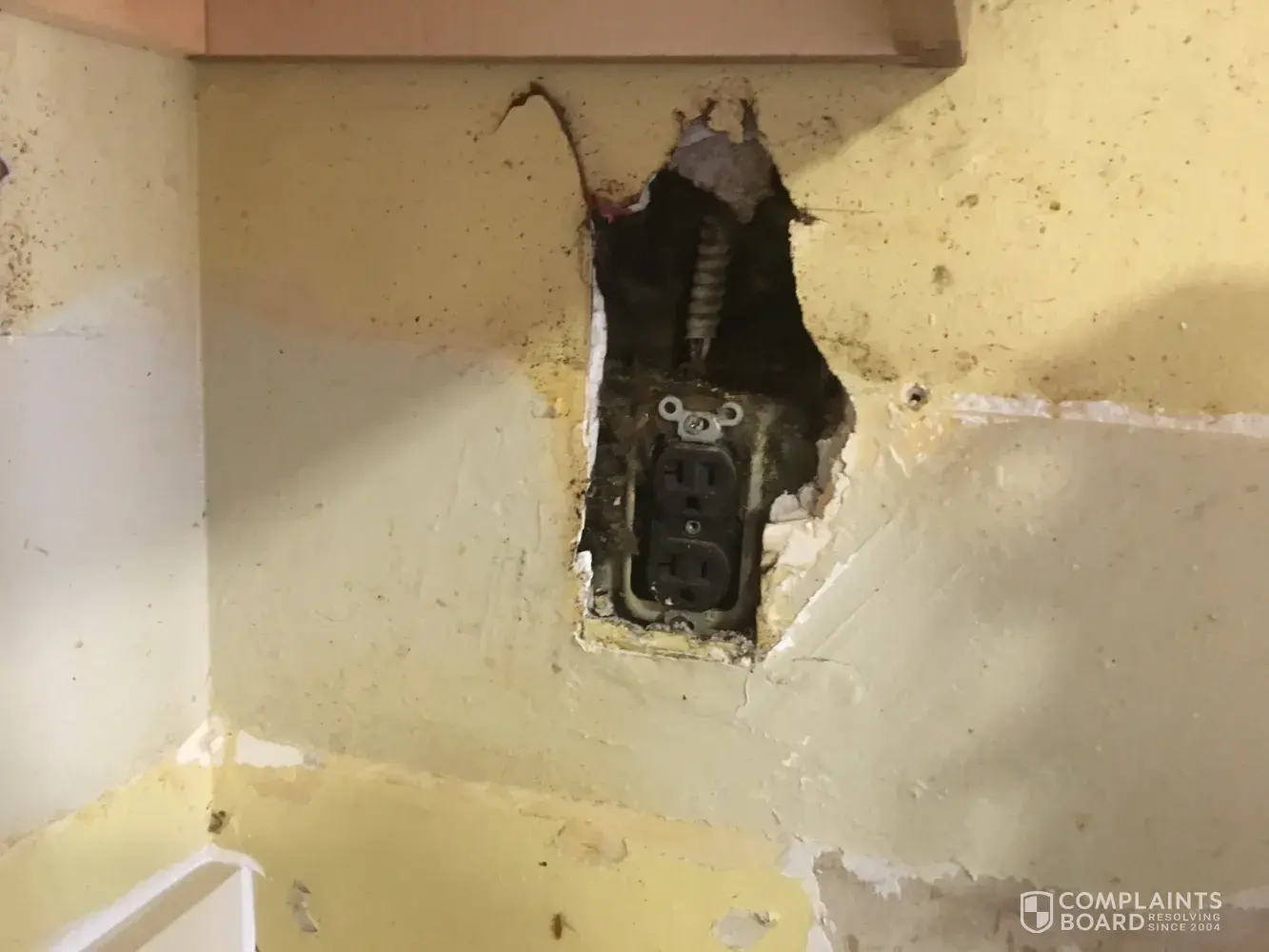 The tech support service guy came in to change cabinets and kitchen basin. He never completed the job while ripping holes into my kitchen exposing outlets and wiring. This is extremely dangerous. He left and said call me you won't have water until Monday. I am 80 years old he didn't give me a chance to speak packed up and left. He did not replace the kitchen basin either. The entire weekend without water a nycha plumber came to finish the job of connecting pipes and getting water running. The basin was not replaced still but I do have water. Holes in walls never fixed with exposed wiring. I am scared to cook and wash in my kitchen with exposed wiring. Please help.