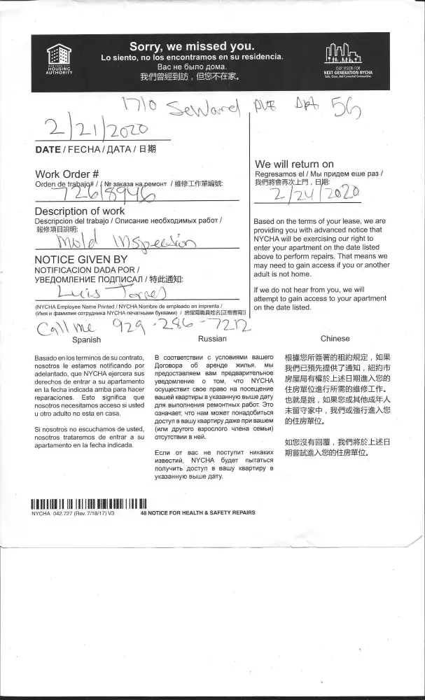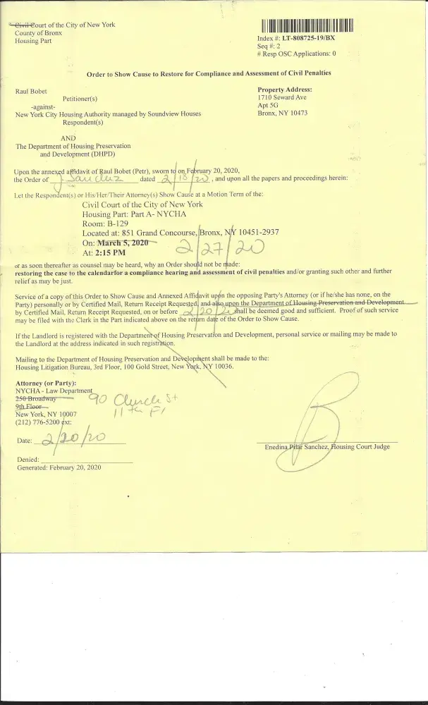 Dear Sir/Madam: Hello, My name is Tony Bobet. I resided at 1710 Seward Avenue, Apt#5-G, Bronx, New York City 10473. I am file another complaint to New York City Housing Authority. located at 1720 Seward Avenue, Bronx, New York City 10473. The management is Noelia Guarduilo and the Superintendent, Mr. Luis Torres. They are not doing their job. On March 04...