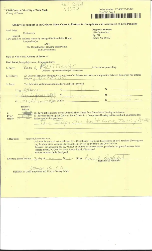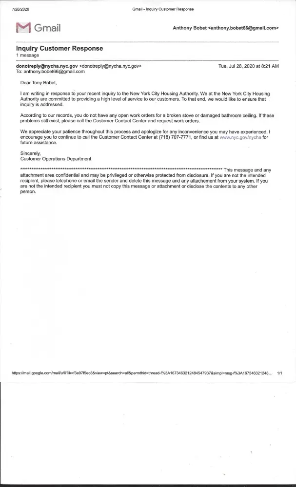 My name is Tony Bobet. I resided at 1710 Seward Avenue, Apartment#5-g, Bronx, NY 10473. I am filling an complaint at New York City Housing Authority that no heat in the apartment. They were heat in the apartment for a short awhile. Here is the tickets# [protected] from April 10, 2020. And, on April 11, 2020. I call for heat and hot water. And, I have the stove...