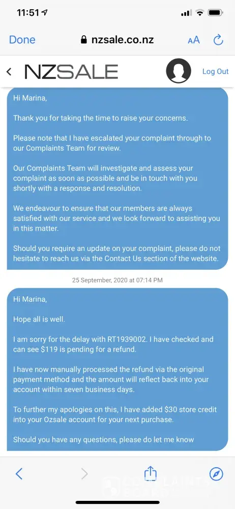 Today after sending multiple emails throughout the week (there are no phone numbers available to talk to anyone of course) I receive another email from a ‘supposedly' complaints services team stating that the refund had not been processed yet and this was processed manually today - 26 sep - and again I need to wait for another 7 days for the money to be into my account! So the complaints team added even more time to the resolution of the problem! And to top it up this email offered $30 credit store! What a joke! I am in the process of filing a formal complaint outside the company!