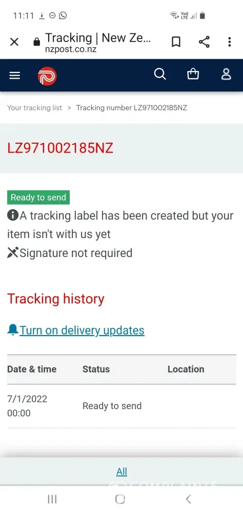 The item was not delivered by the estimated date. I contacted NZSale and asked for an update. I was told it would be delayed, and that it had now left Australia and was enroute to NZ. I waited, and the tracking still has not changed weeks later, it now says "a tracking number has been allocated, but your parcel is not with us yet" on NZ post.