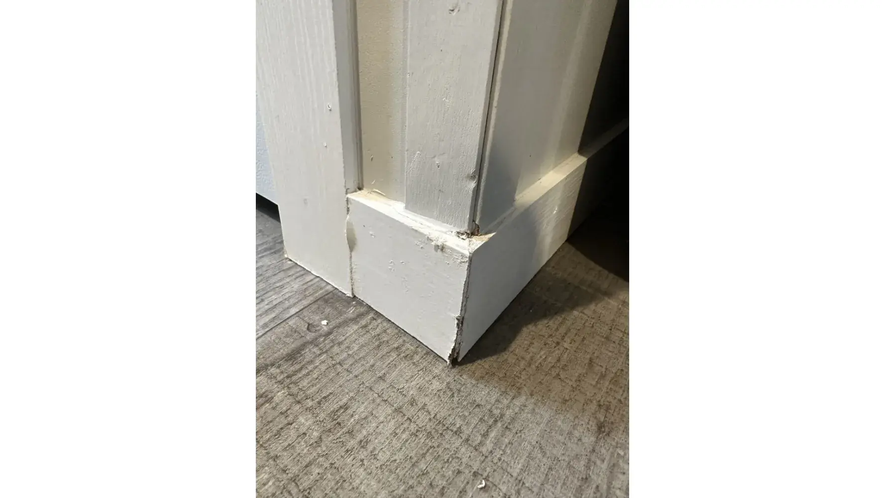 4.) Crooked doors, poor seals, wind comes in/drafty. Truly trash doors, I have to hang blankets up over the doors to partially stop the drafts. Had to tape up drafts around the door knobs and edges of doors and still the cold or heat comes in because they are paper thin.