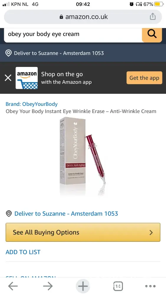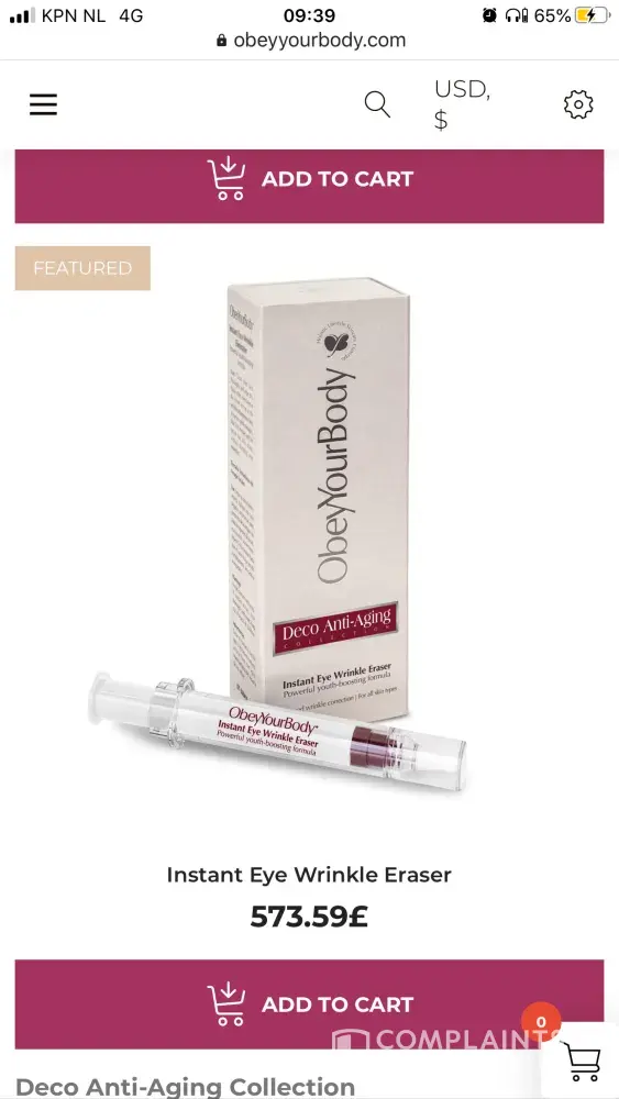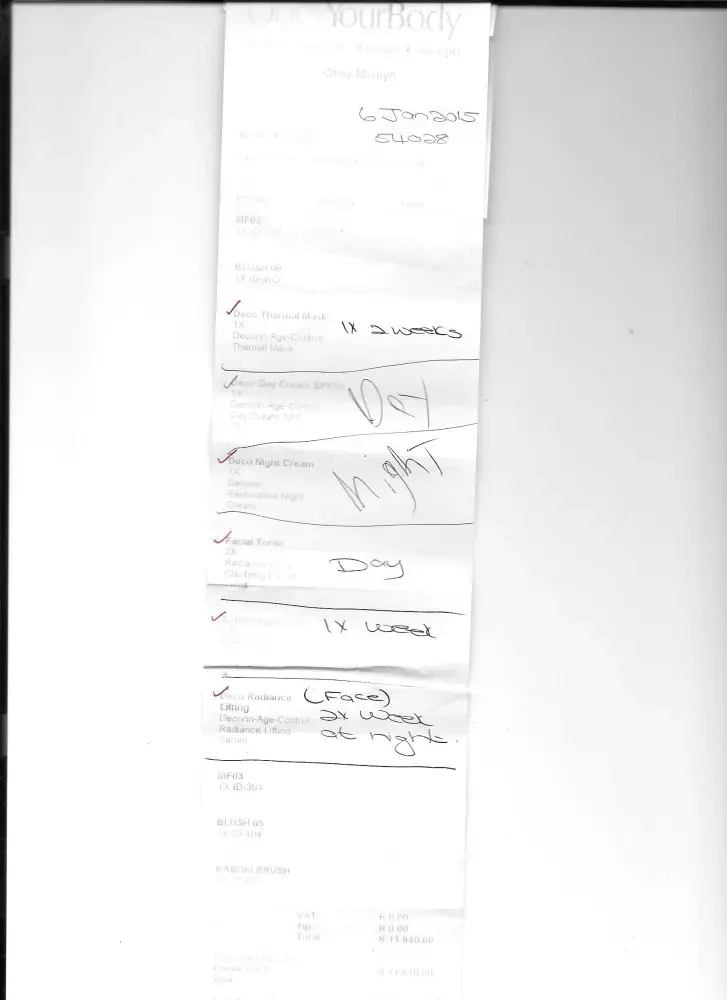 When coming through Cape Town airport, I was approached by a very pretty spanish saleslady, she said that for today only we have a great deal 50% of the original price and proceeded to apply some of the cream under my eyes, said it is a years supply and I will be very happy with the result, well the eye cream is in a syringe and only has 13g in it, plus the tube was half empty and I have used it 5 x so far and not noticed any difference. I also purchased a face peel so together it cost me R3700. I think this is definitely overpriced and feel I was conned by giving me false information. Be ware anybody that purchases from "Obey Your Body! "