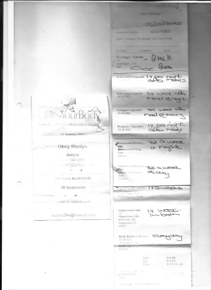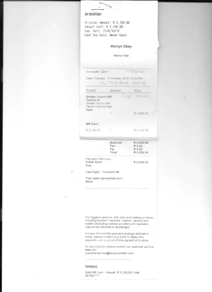 On 06.01.2015 I was manipulatively and pressured into buying R52968.00 worth of Obey your body and other brand names products at the store in Menlyn Shopping Centre, with the promise of free facials and refill of products on returning with the empty containers/bottles for on one sale 24 months and the other one 36 months as from January 2015 thus making it a supply of products over 3 years. On 13.10.2015 I went for a facial and were once again convinced to buy a "gift card" value R2100.00 for use as I see fit. Exp date: 12.10.2016 not being used as to date.